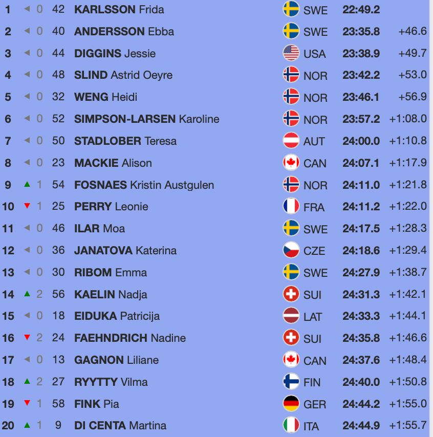 I tio kilometer fri stil blev det dubbelt svenskt i toppen genom Frida Karlsson och Ebba Andersson. Jessie Diggins från USA tog brons.