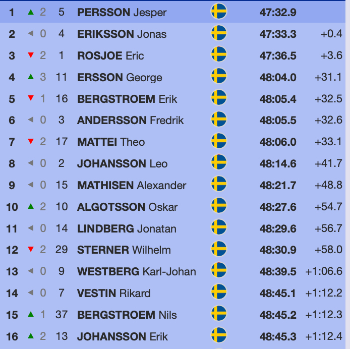 Nu var det åtta norrmän i topp följd närmast av en fransman, en ryss, två norrmän och Leo Johansson på plats 13.