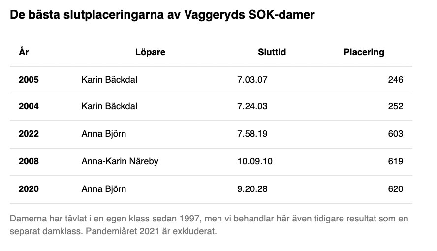 På söndag går starten för det 99:e Vasaloppet. Newsworthy har samlat in och sammanställt samtliga Vasaloppsresultat sedan 1991. Det ger oss en unik inblick i hur skidåkare från klubbar i Vaggeryds kommun har klarat sig genom åren.
