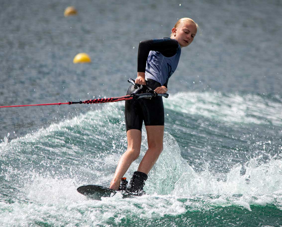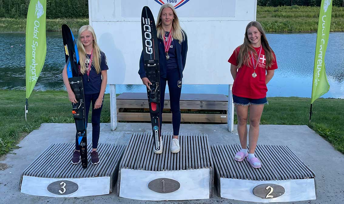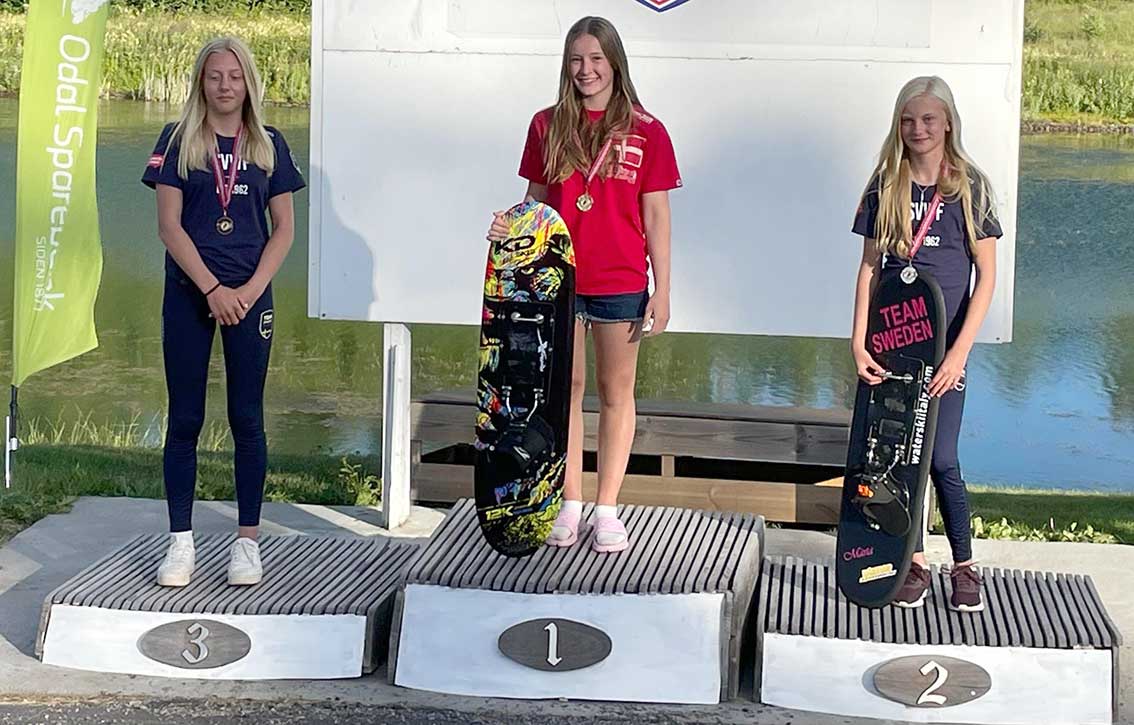 Märta Olsson, 13, från Värnamo är en av kring 15 svenskar som tävlade vid Nordiska Mästerskapen på vattenskidor i helgen och det blev flera medaljer för Märta och för flera av de andra från Sverige.