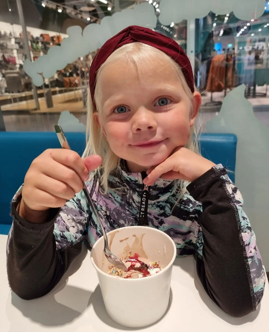 En liten tös som blivit en stor tjej sedan hon började skolan i höstas. Det är mormor, morfar, morbror och moster med respektive samt kusinerna Siri, Elias, Theo, My och storasyster Tove som hurrar på hennes dag. Gammelfarfar Göte skickar en hälsning tillsammans med Daniell och Nathalie. Mamma och pappa hurrar från Badplatsvägen.
