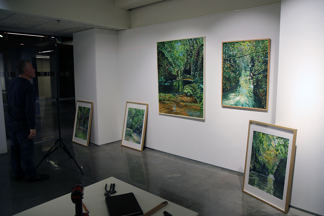 – Jag har under sju-åtta års tid arbetat med ett tema kring en bäck i Pyréneerna i norra Spanien. Det är smältvatten som kommer ifrån bergen som har skapat en fåra nere i odlingslandskapet, nästan som ett mikroklimat nere i bäcken. Första gången jag var där för åtta-nio år sedan så fanns det inga stigar, det var väldigt svårtillgängligt, vattnet var iskallt och det fanns små vattenfall längre ned. Precis som i Anitas fall så betyder den här platsen väldigt mycket för mig. Man känner en närhet och ett lugn och jag har samma känsla när jag sitter och målar den här platsen, säger han.