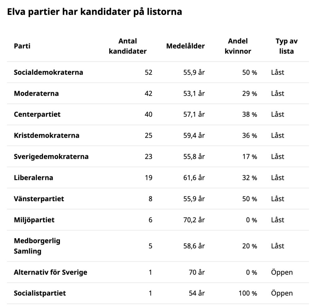 Flest anmälda kandidater, 52 personer, har Socialdemokraterna. Tittar man på partierna med mer än en handfull kandidater är medelåldern högst hos Miljöpartiet (70,2 år) och lägst hos Moderaterna (53,1 år). Andelen kvinnor är högst hos Socialdemokraterna och Vänsterpartiet (50 procent) och lägst hos Miljöpartiet (0 procent).