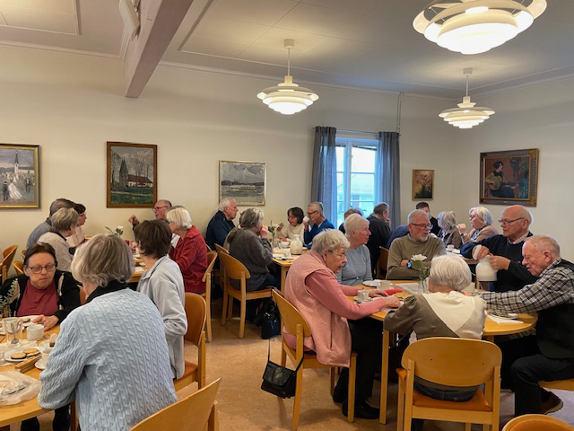Cirka 80 pensionärer hade masat sig dit i spänd förväntan på vad eftermiddagen hade för roligt att bjuda på. Elin A. från grupp 7 hälsade oss välkomna, tillika trubaduren Gösta Persson från Sävsjö.