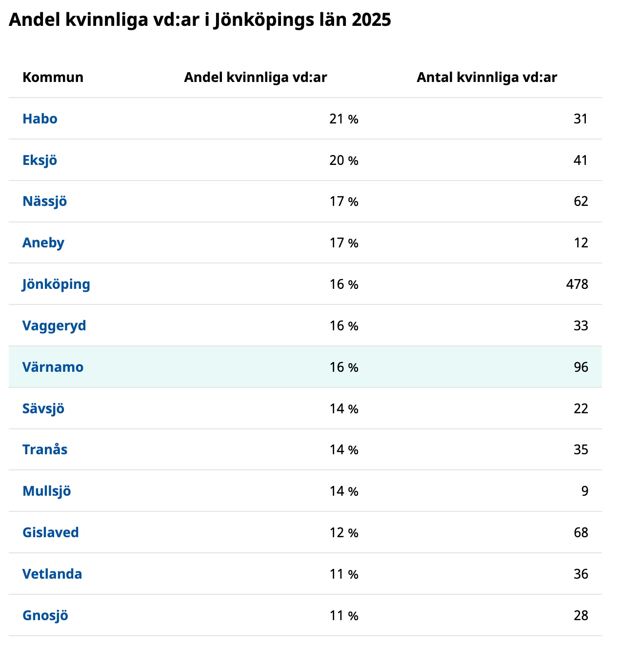 Det är fortfarande män som är vd i nästan fyra av fem bolag i Sverige och i Värnamo är det alltså en lägre andel kvinnor på vd-posten. Högst andel kvinnliga vd:ar i Jönköpings län har företagen med säte i Habo kommun, 21 procent. Lägst är andelen bland företagen med säte i Gnosjö kommun, 11 procent.