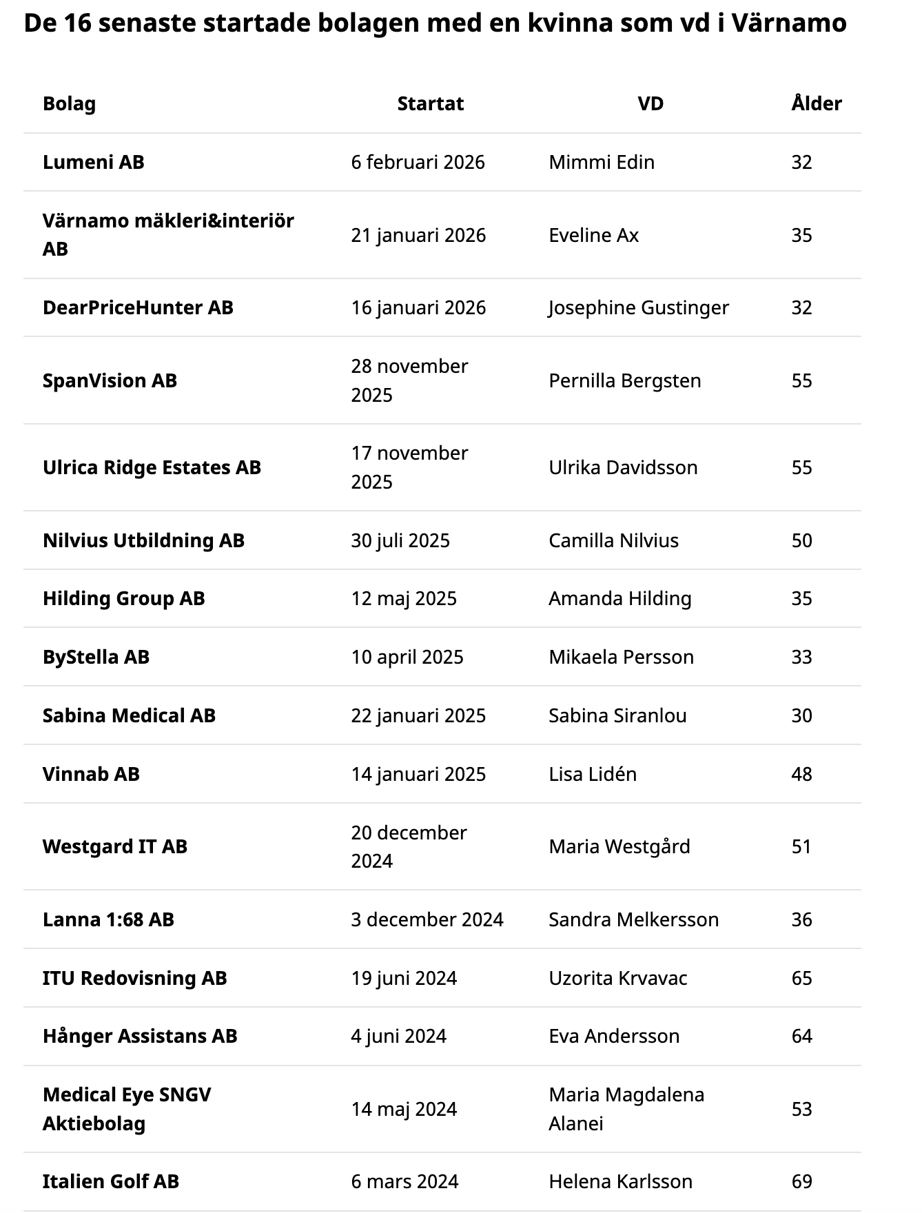 I riket som helhet är 22 procent av vd:arna som är under 50 år kvinnor, medan motsvarande siffra för direktörerna som är äldre är 20 procent. I Värnamo är det ingen större skillnad i andel kvinnliga vd:ar i de olika åldersgrupperna.
