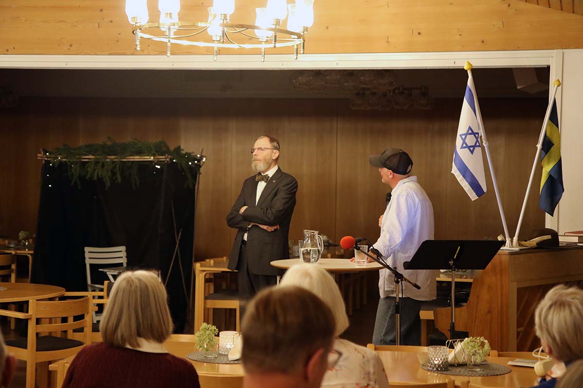 – Ni ser ni har lite saker på bordet lite äpple och honung, vi ska gå igenom det. Vi har även en sak som gömmer sig bakom väggen här, men det är tanken att vi ska prata om det här utifrån det judiska perspektivet. Sedan har jag några tankar utifrån mig som kristen, hur det här kan gå in i min syn på detta, inleder Daniel Coster.