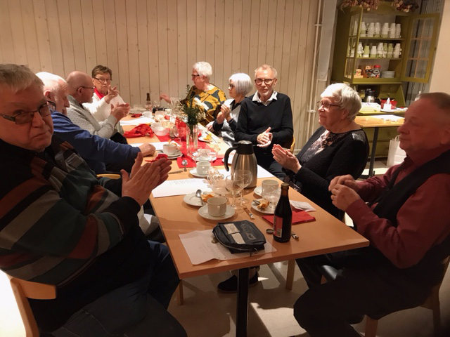 Det var 64 munnar att mätta men ingen åkte hungrig därifrån. Det kändes verkligen att det var hemlagad mat! Vid olika tidpunkter sjöngs det julallsånger under ledning av Elin Ahlqvist och Leif Nygren. Pianot sköttes galant av Gunnel Elf. Mellan tuggorna serverades information om vinterns studiecirklar av Karl-Magnus Svensson. Det blir minst fyra stycken med början efter nyår. Det märktes inte mycket av coronasituationen under eftermiddagen, men en planerad bussresa i januari sköts på till våren på grund av det osäkra läget.