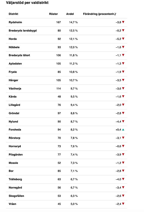 94 röster, och 8,2 procent, gör att distrikt Forsheda ökar jämfört med tidigare valresultat för Kristdemokraterna som har sitt starkaste fäste i Rydaholm där 14,7 procent röstade på partiet.