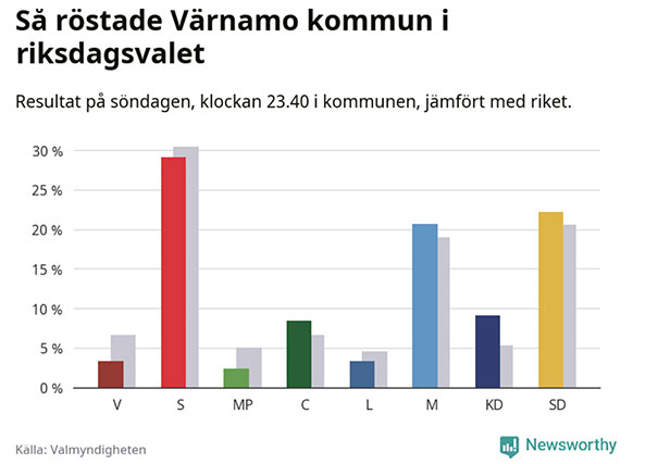 När den första rösträkningen är klar i nästan hela riket, ser Kristdemokraterna ut att gå mot sitt sämsta riksdagsval sedan 1982 i Värnamo kommun, med 9,2 procent av rösterna i riksdagsvalet.