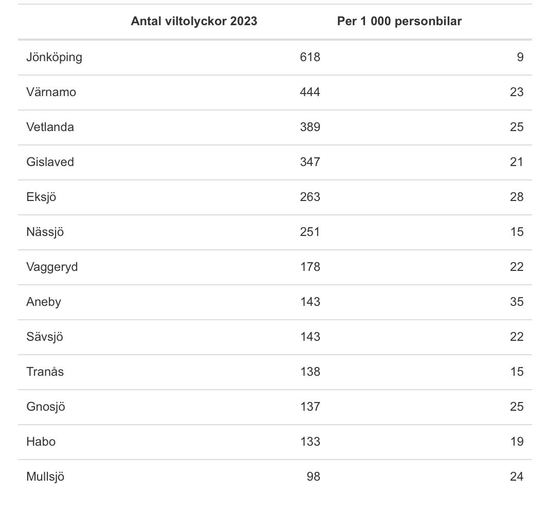 Jönköpings kommun hade under 2023 det högsta antalet rapporterade viltolyckor i länet med 618 incidenter. Sett till bilparkens storlek var Aneby den mest olycksdrabbade kommunen. Wedin betonar vikten av att bromsa snarare än att göra en hastig undanmanöver vid en kollision för att minska risken för allvarligare olyckor.