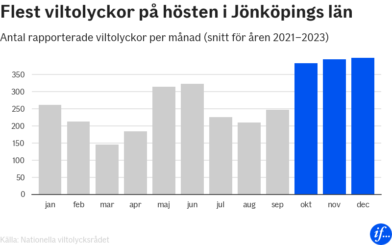 Oktober och november är de mest riskfyllda månaderna för viltolyckor i Sverige, och bara i Jönköpings län väntas närmare 800 incidenter inträffa. Risken är som störst under gryning och skymning när djuren är som mest aktiva i sin jakt på föda.