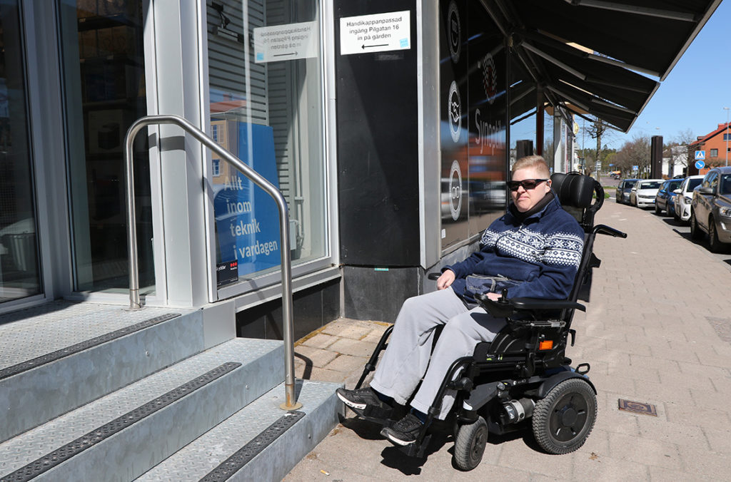 Värnamobon Emmanuel Holmberg riktar nu skarp kritik mot bristande tillgänglighet i stadskärnan efter flera upplevelser där han inte kunnat ta sig in i butiker med sin permobil.