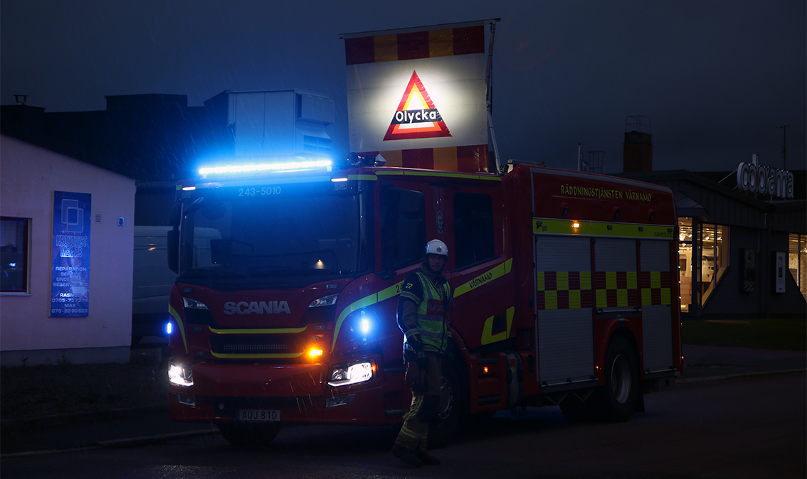 – En person har kört in i en lyktstolpe, en drabbad men ingen vård behövs. Räddningstjänsten är där och kontrollerar att det inte läcker någonting, även polisen är på plats, berättar SOS ledningsoperatör.
