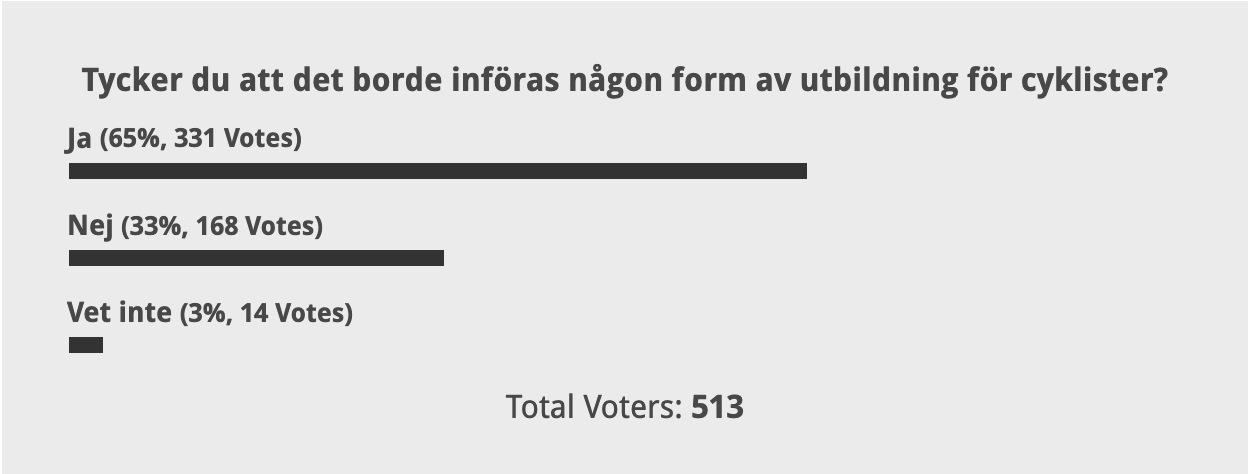 Förra veckan ställde vi frågan "Tycker du att det borde införas någon form av utbildning för cyklister?"