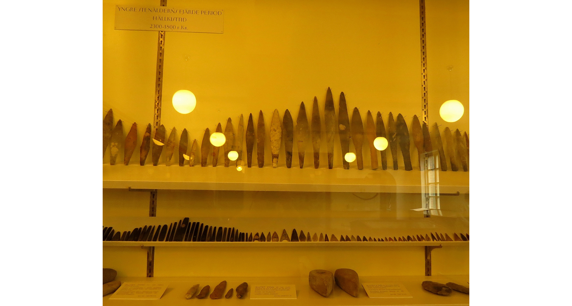 Bilden visar ett stort antal stenföremål från tiden 2300-1800 före Kristus, den så kallade Yngre Stenåldern, även kallad Hällkisttid, med andra ord, tiden för hällkistorna.