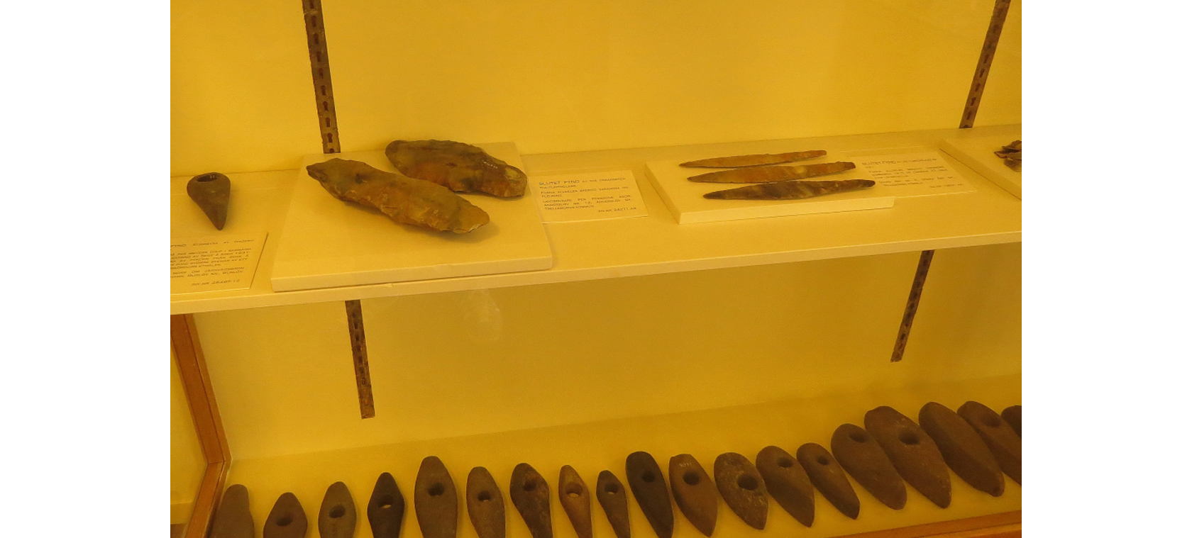 Bilden visar flintyxor och flintdolkar samt stenyxor från den så kallade yngre stenåldern, tiden 2300-1800 före Kristus.
