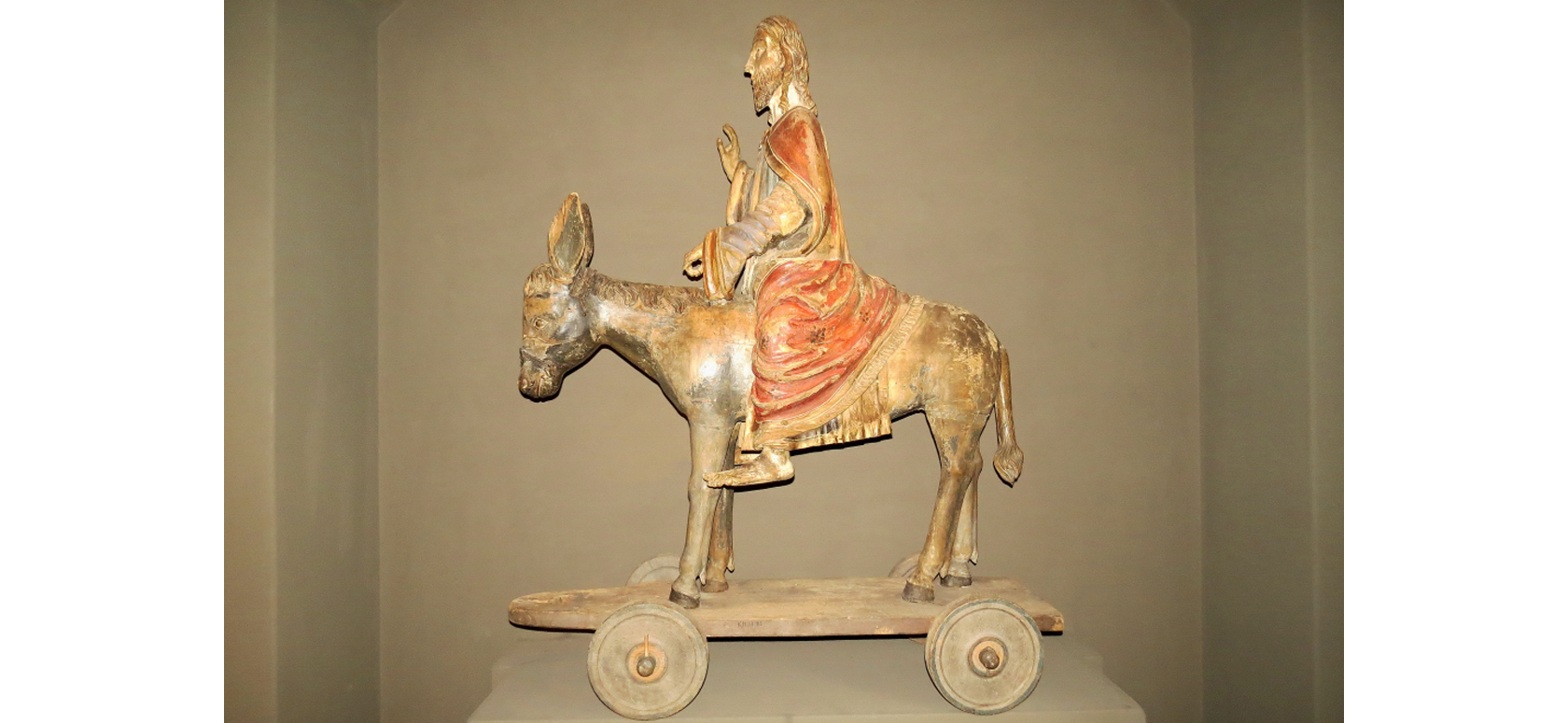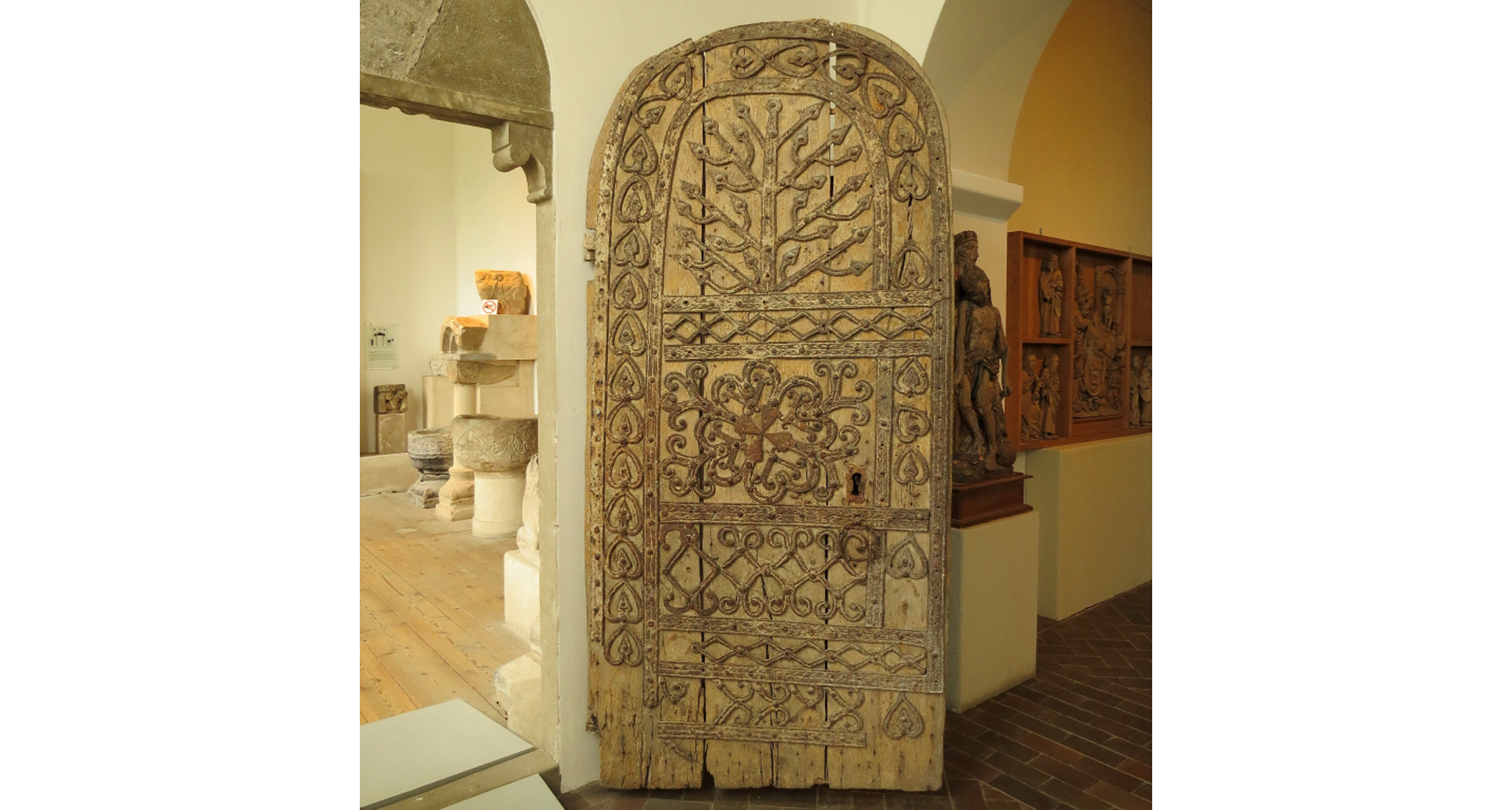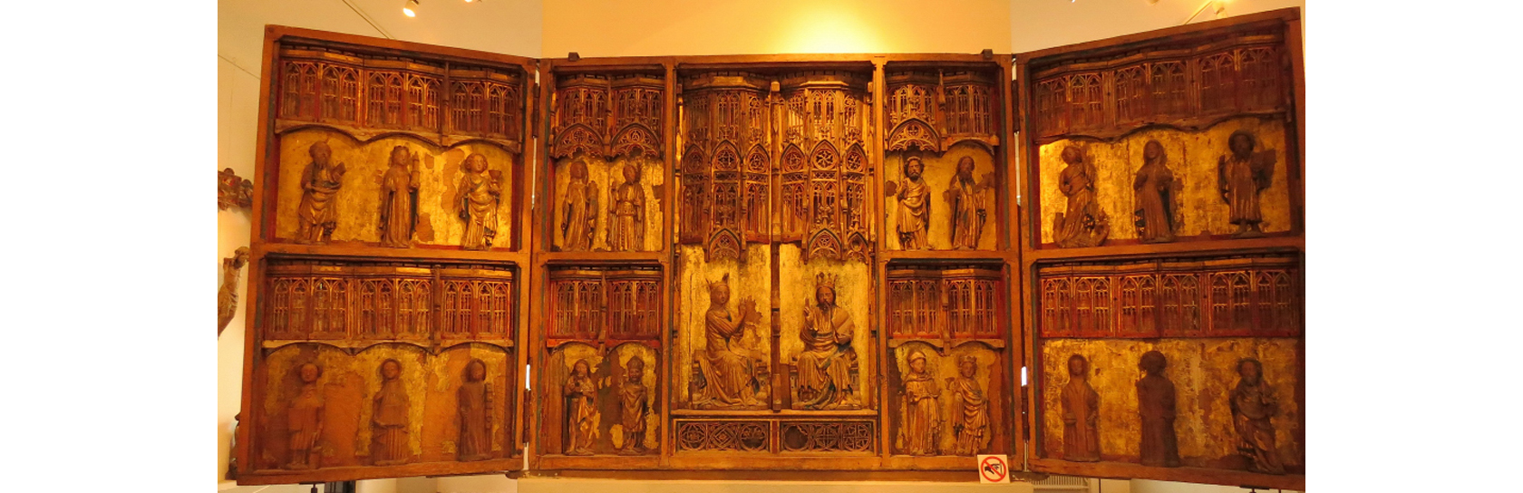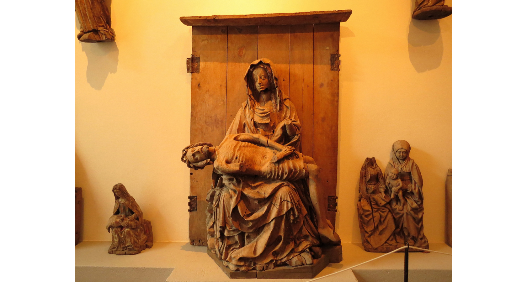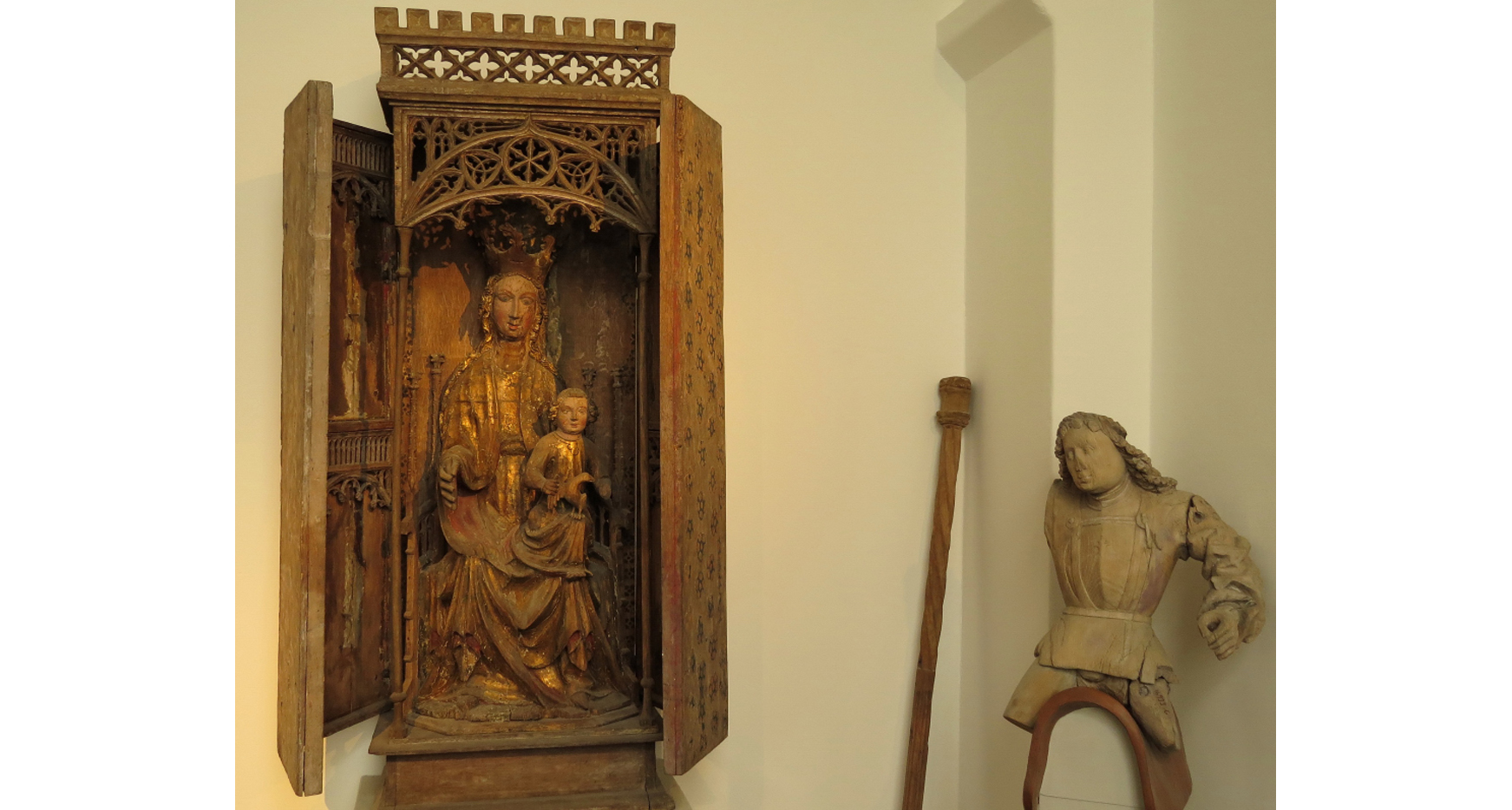 Till vänster ser man ett helgonskåp med tronande Madonna i ek från 1400-talets första hälft, från Norra Nöbbelöv.