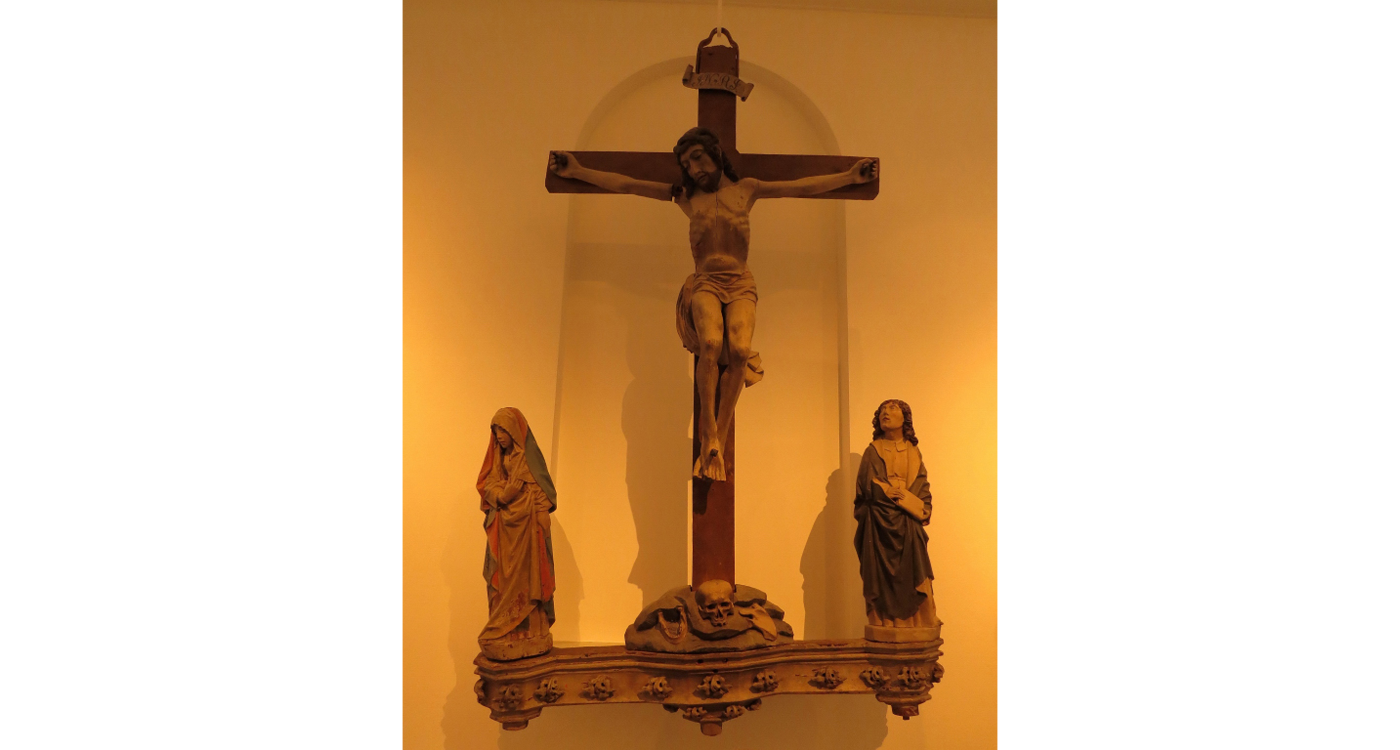Litet längre från korset står på den högra sidan Maria och på den vänstra Johannes, och utanför dem finner man från karolingertiden två symboliska kvinnogestalter, Ecclesia för kyrkan och Synagoga för judendomen.