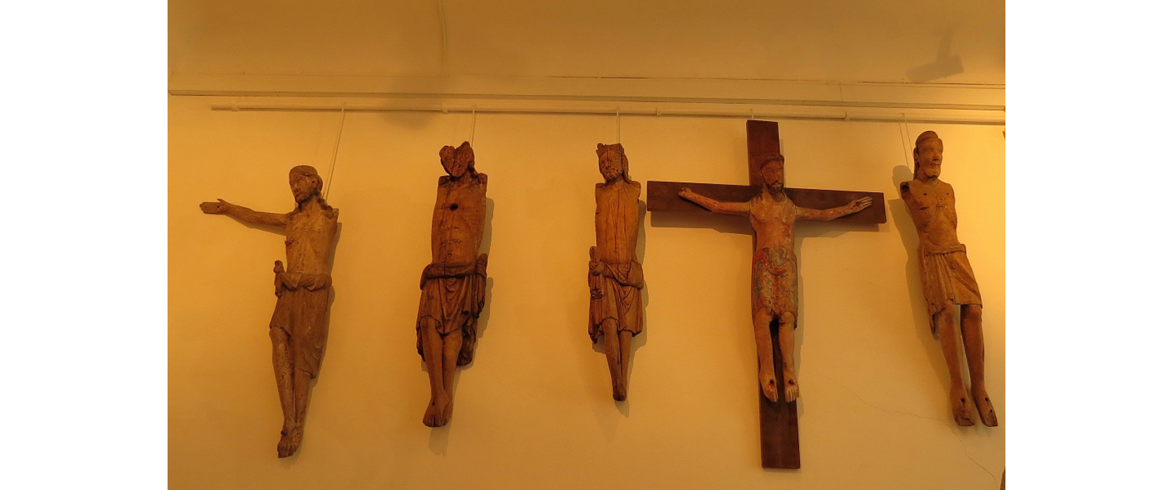 Bilden visar fem krucifix som funnits i Skånska kyrkor under 1100-talet och 1200-talet, bland annat i Rebbelberga, Osby, Skegrie, Gärdslöv och Ignaberga.