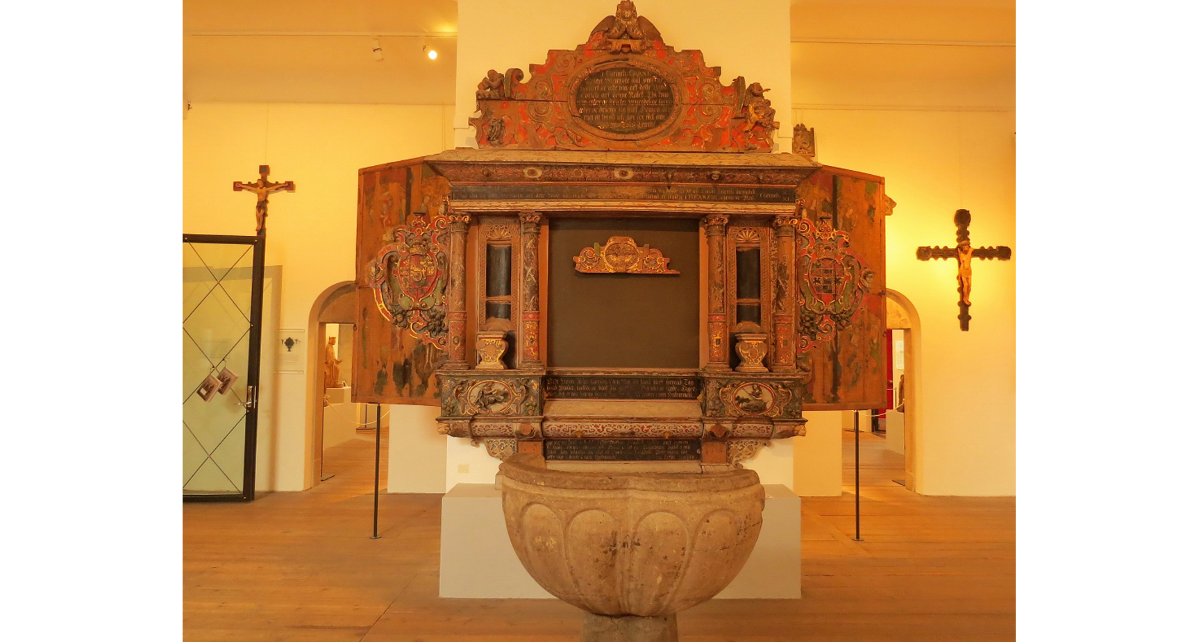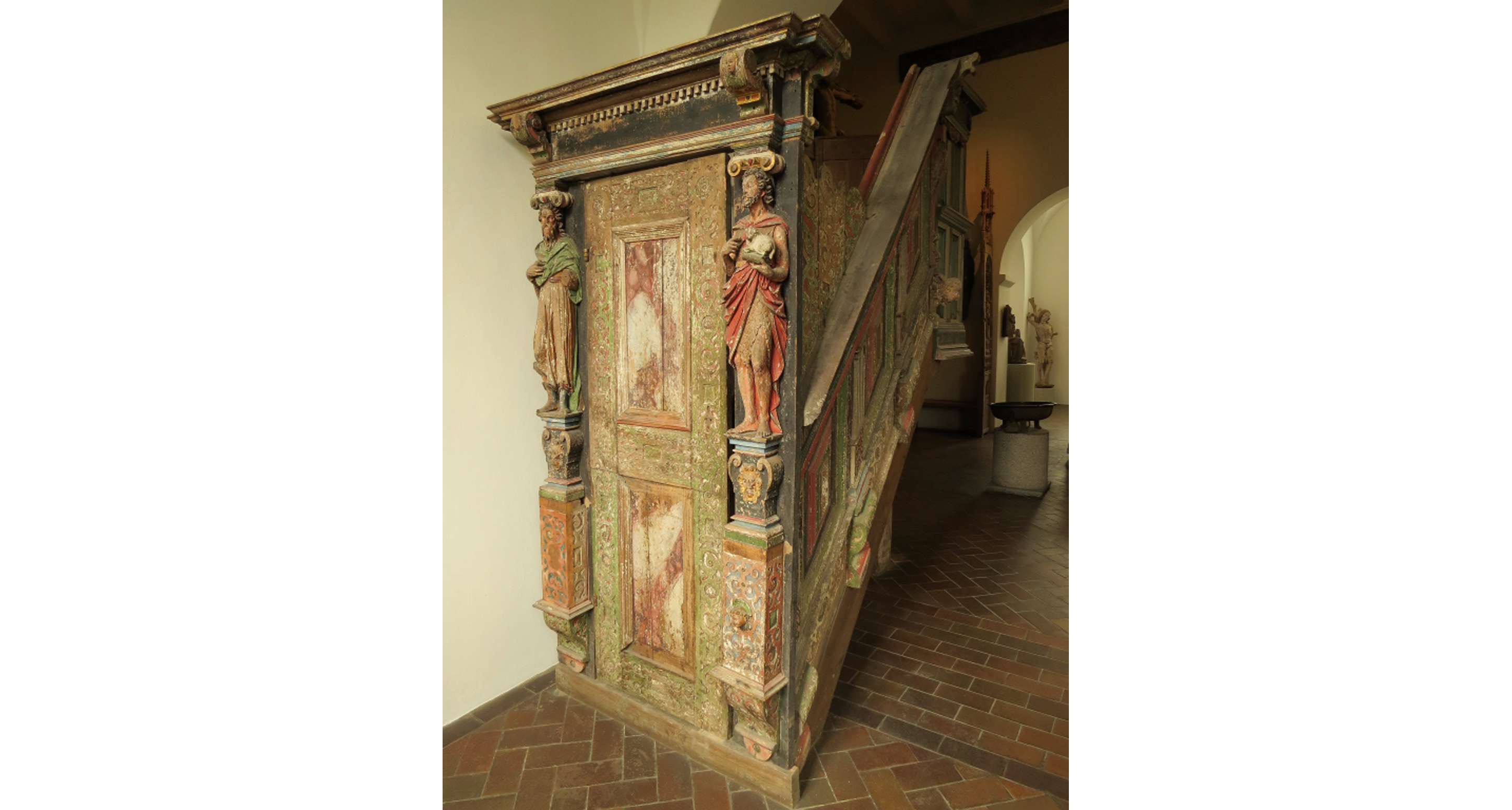 Det är verkligen inte svårt att känna historiens vingslag när man går omkring bland de gamla och mycket vackra föremålen på Lunds historiska museum, här ser man dörren och trappan upp till en predikstol.