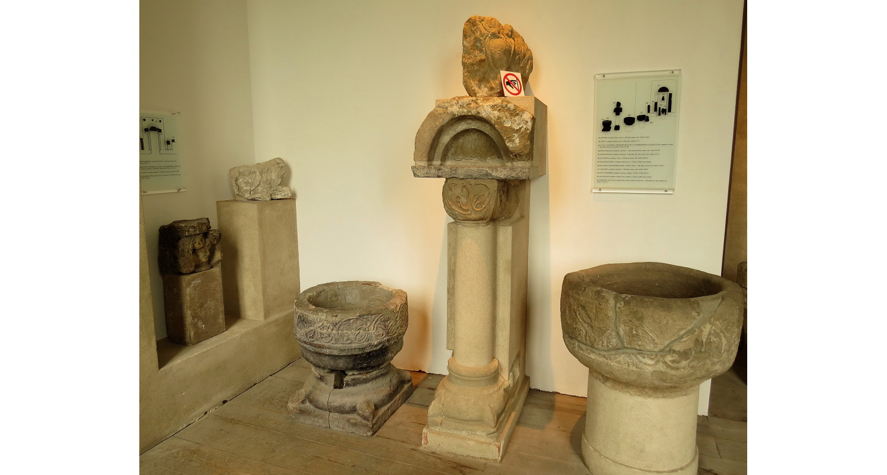 Två dopfuntar från början och mitten av 1100-talet ramar in en kolonn med delar från en lejonskulptur också denna från 1100-talet.