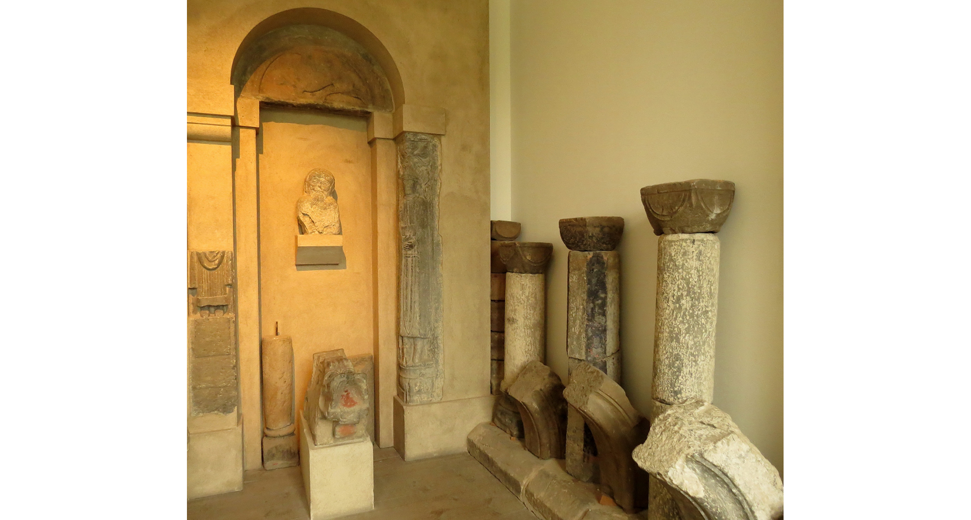 Till höger på bilden ser man kolonnskaft, bågfragment och sockelstenar från 1100-talet i sandsten och kalksten från okända skånska kyrkor.