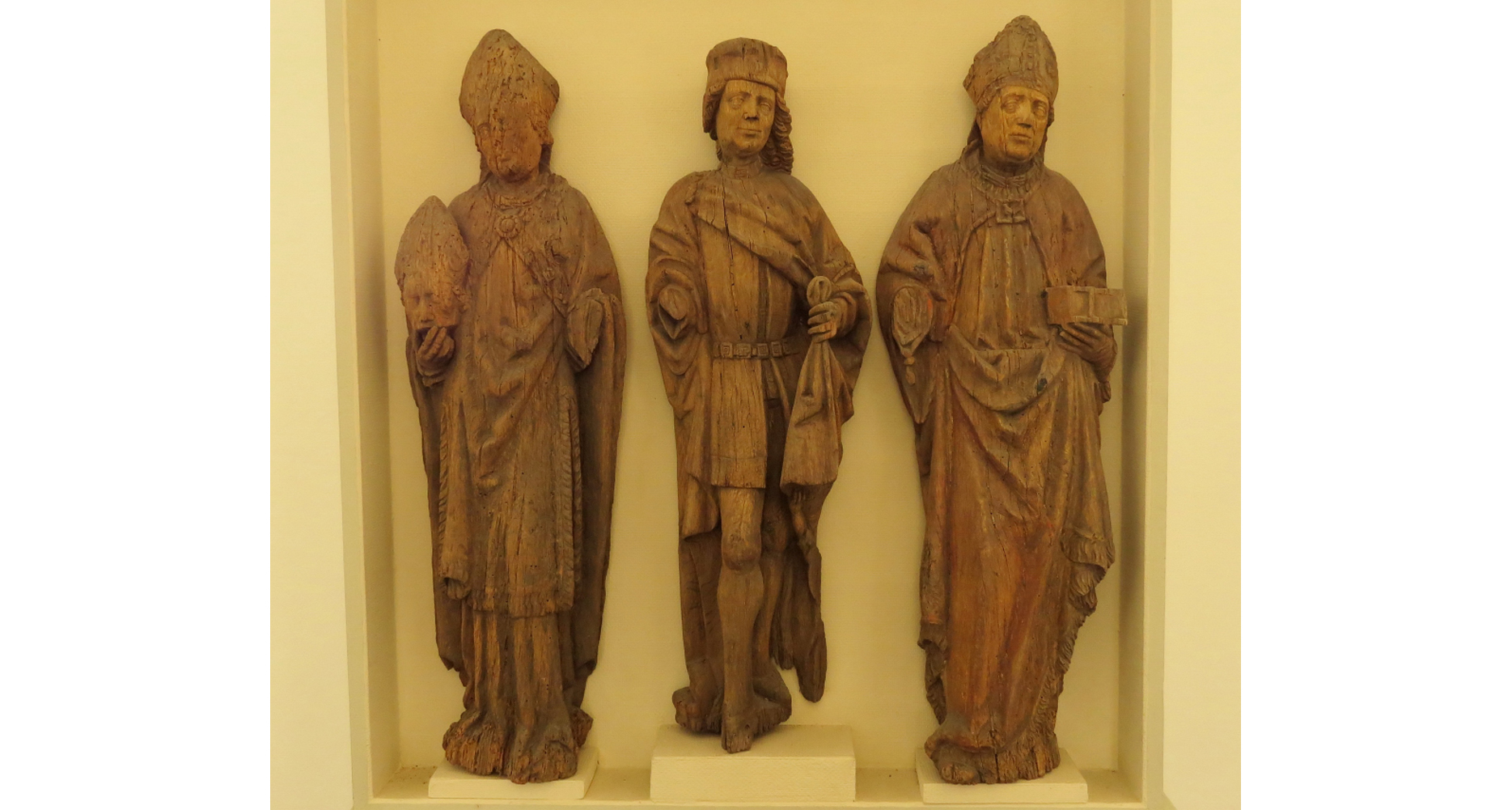Bilden visar tre biskopshelgon i ek från 1300-talets mitt, från Brösarp i dagens Tomelilla kommun på Österlen.