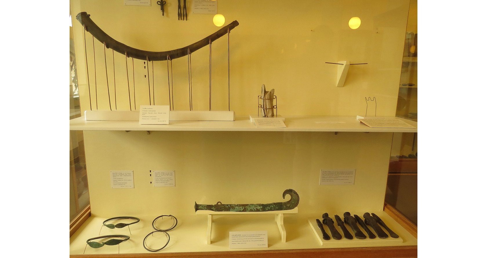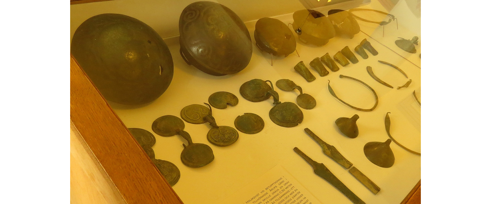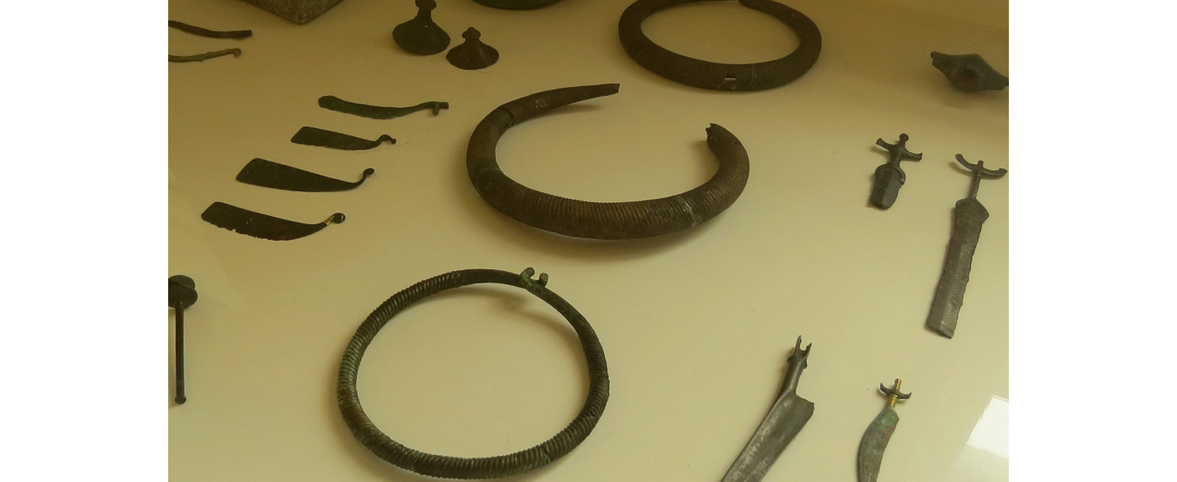 Bilden visar ett antal halsringar och svärd med mera av framför allt brons som daterats till tiden 1800-1500 före Kristus och som låg i samma monter som föremålen på föregående bild.