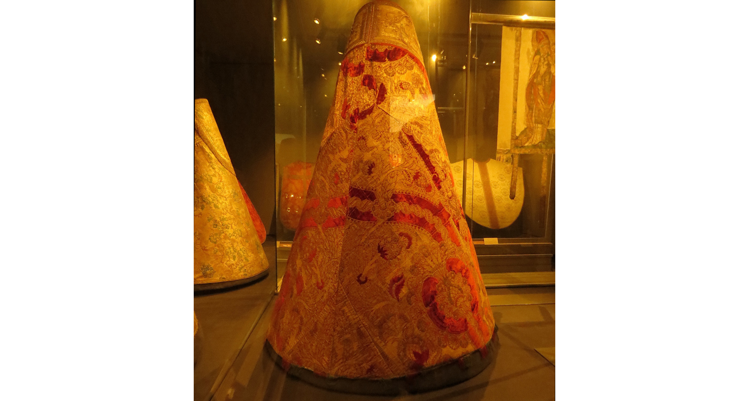 Bilden visar en korkåpa, en sammetsbrokad med stora mönster av granatäpplen, tistlar och grenverk i skuren och oskuren röd silkesammet mot guldgrund.
