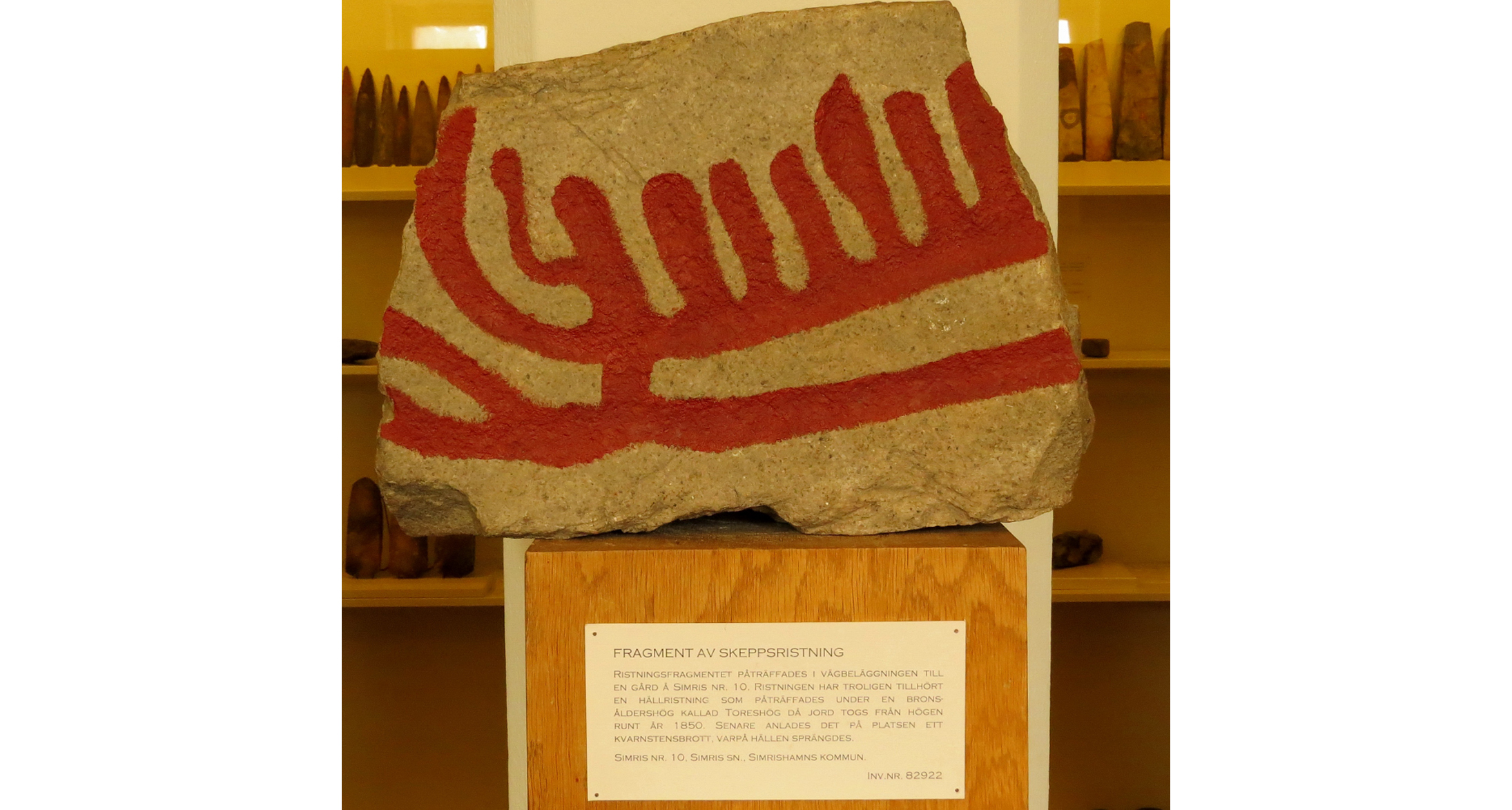 Bilden visar ett fragment av en skeppsristning och har troligen tillhört en hällristning som påträffades under en bronsåldershög kallad Toreshög då jord togs från denna till en vägbeläggning år 1850.