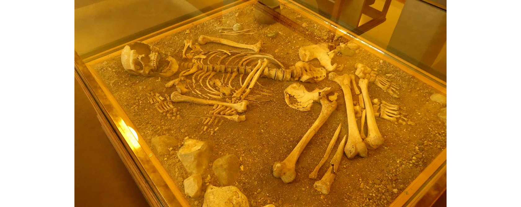 Notera den mänskliga skallen till vänster på bilden med ett hål i hjässan, olycka, strid eller kanske till och med operation då kanterna ser ut att ha påbörjat en läkningsprocess, det vill säga, personen har levt relativt länge efter att ”hålet” blev till.