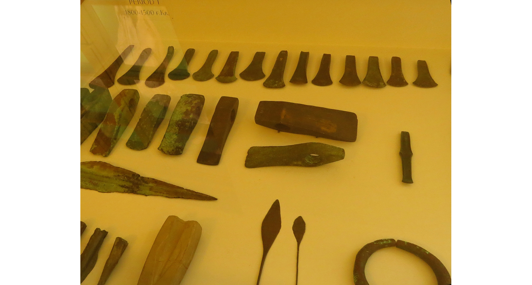 Bilden visar ett antal yxhuvuden och spjutspetsar med mera av framför allt brons som daterats till tiden 1800-1500 före Kristus.