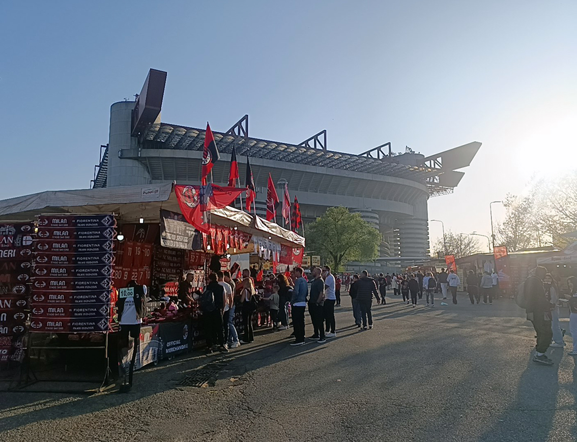 Bild på en marknadsvagn med AC-Milanprodukter. I bakgrunden badar Stadio Giuseppe Meazza, i folkmun kallad San Siro, i eftermiddagssolen. Bild: David Alin