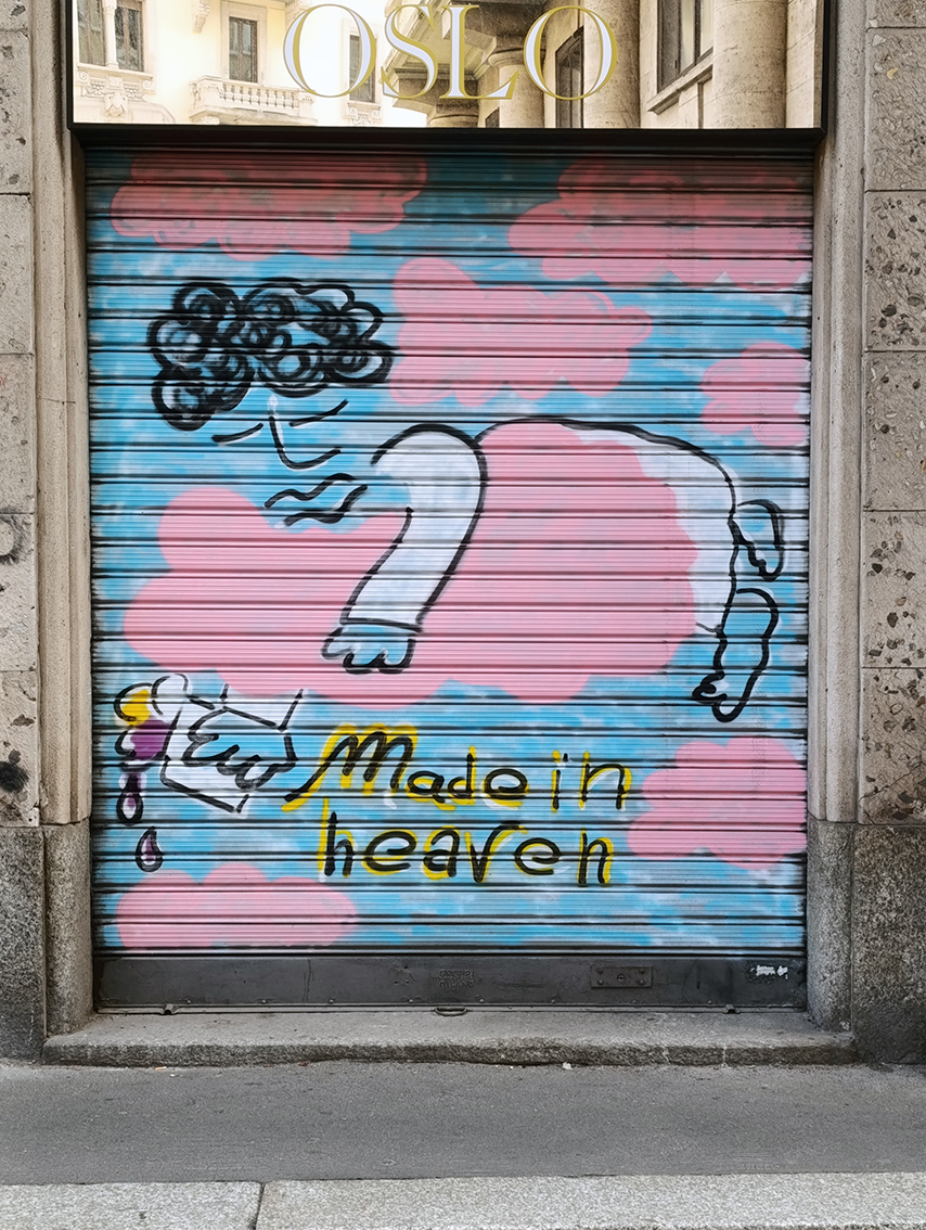 Den här fina graffitimålningen fick vi syn på under söndagens strosande i centrala Milano. Den föreställer en ängel som svävar på ett moln som spiller ut vätska över vår värld. Tänk vad lite färg kan göra på ett butiksskydd.