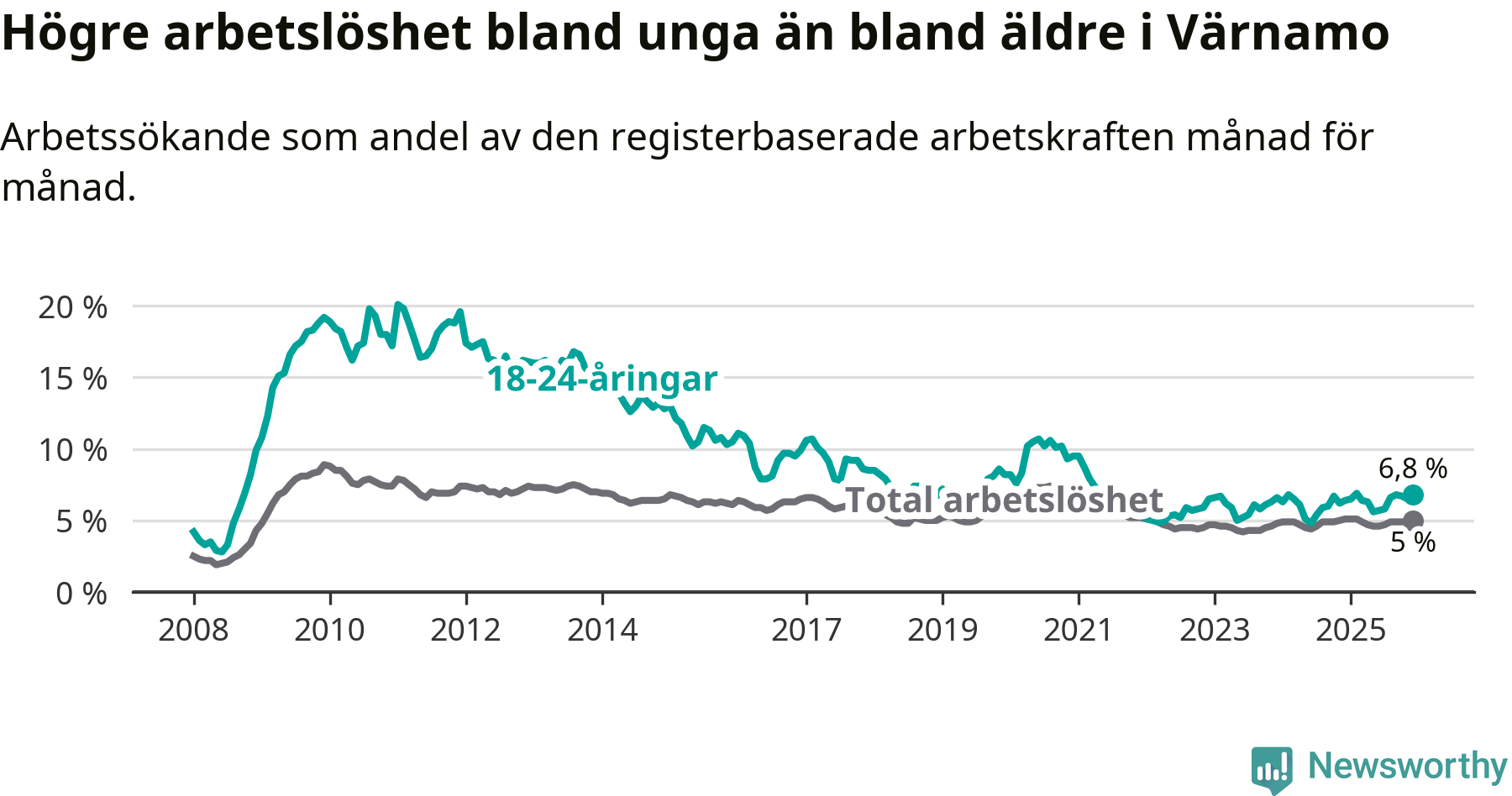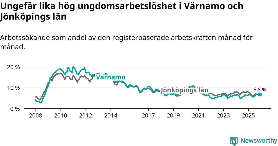 Medan Värnamo har lägre total arbetslöshet än Jönköpings län, ligger ungdomsarbetslösheten på i stort sett samma nivå.