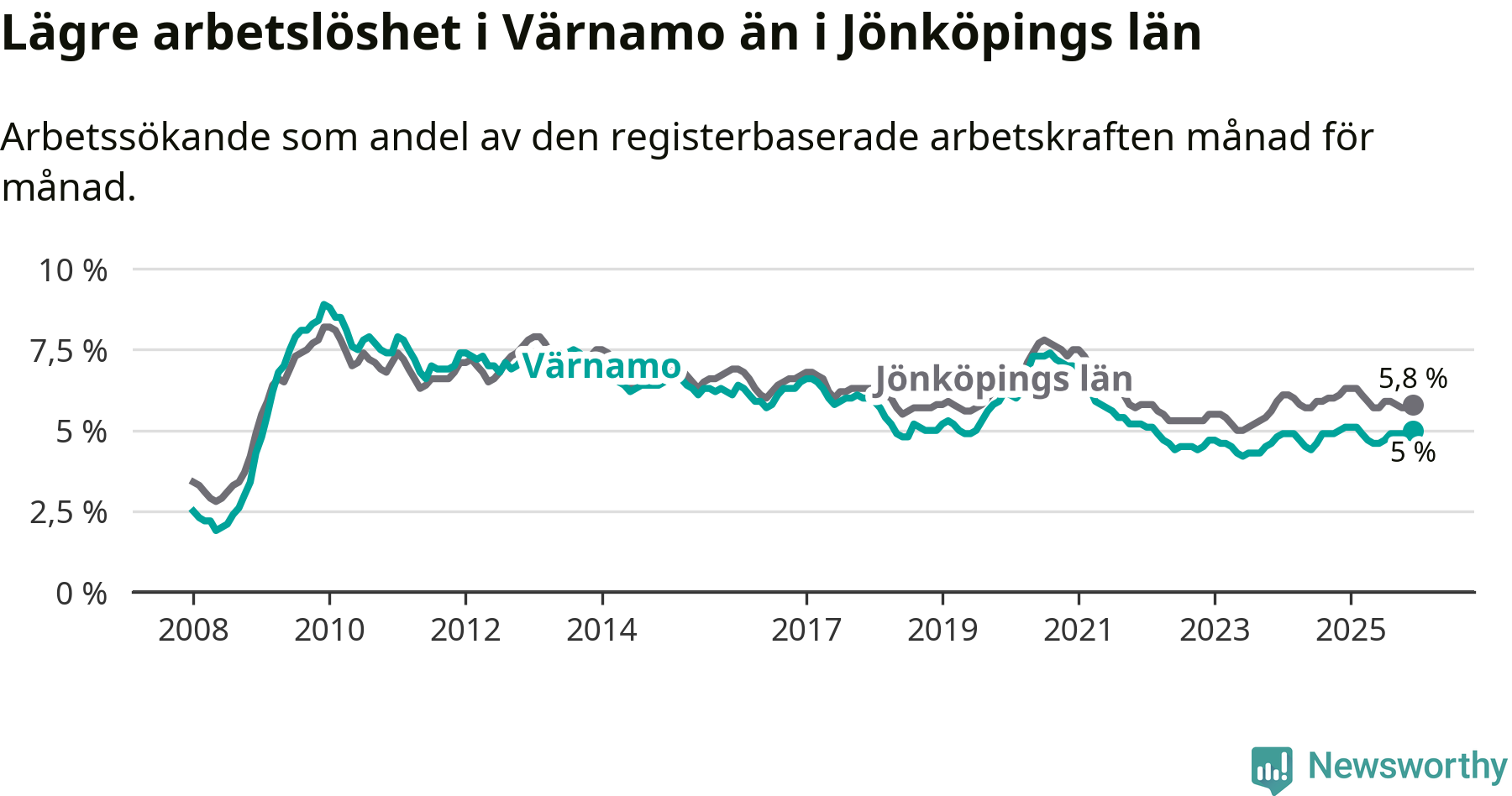Värnamo hade redan tidigare lägre arbetslöshet än snittet i hela Jönköpings län och nu växer klyftan (5,0 procent i kommunen, jämfört med 5,8 procent i hela länet). Habo har den lägsta arbetslösheten i länet (3,3 procent), medan Sävsjö har den högsta (7,9 procent). För att Värnamo skulle komma ner i samma arbetslöshetsnivå som Habo skulle 295 personer behöva sysselsättas.