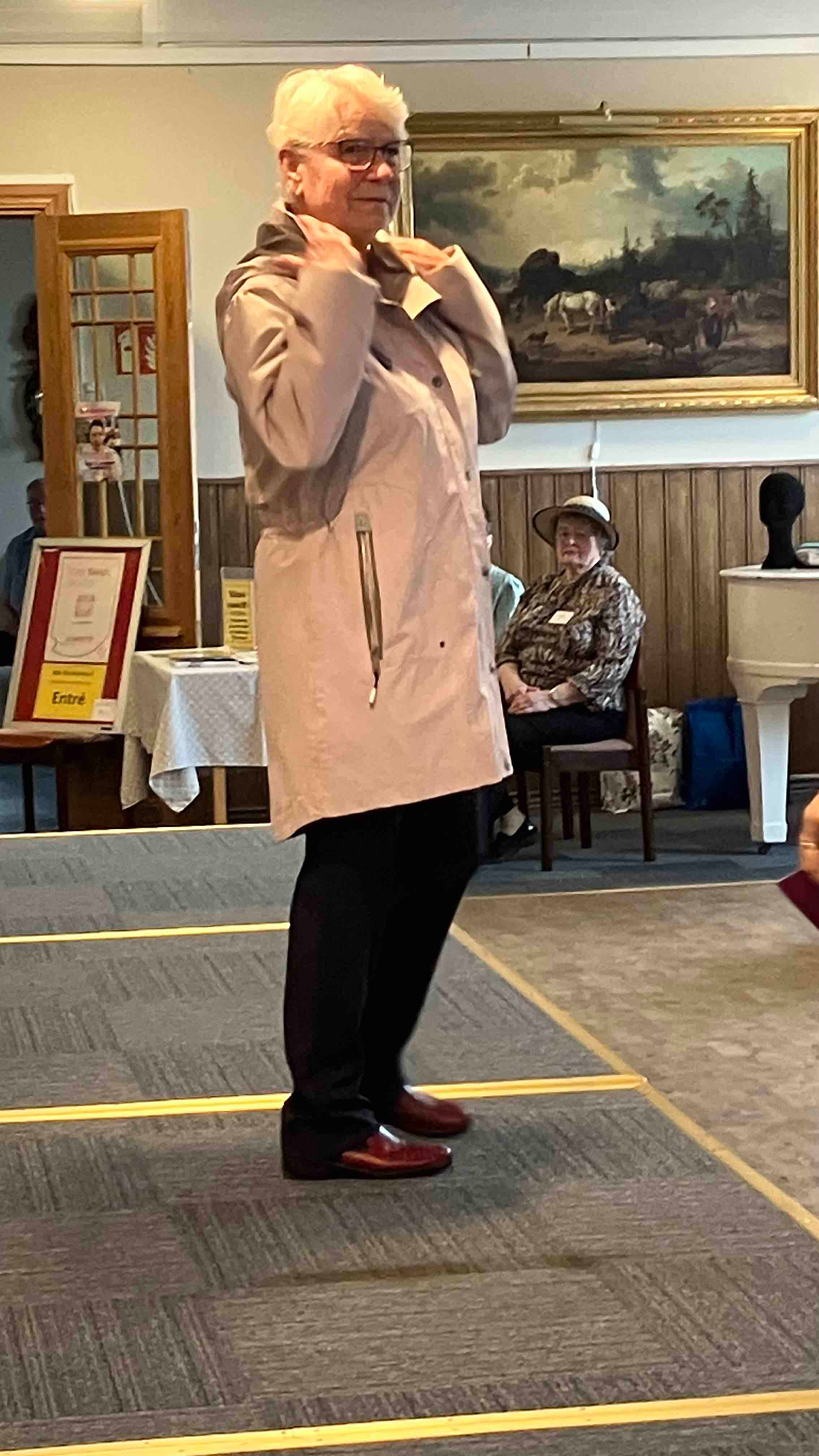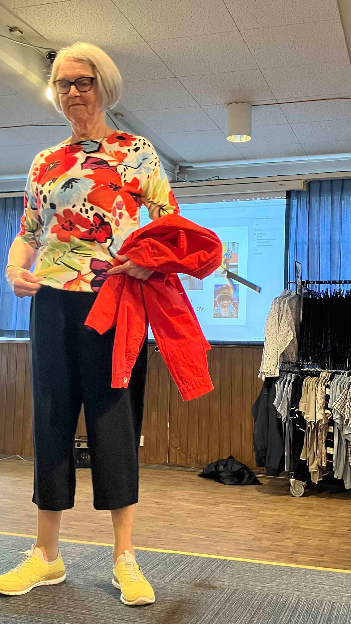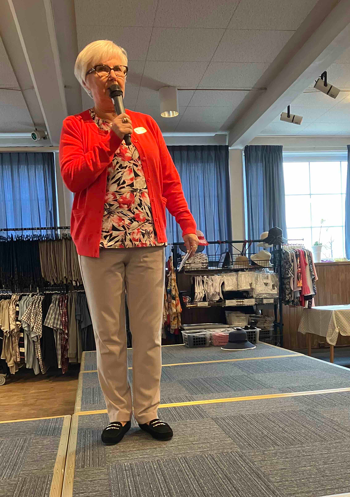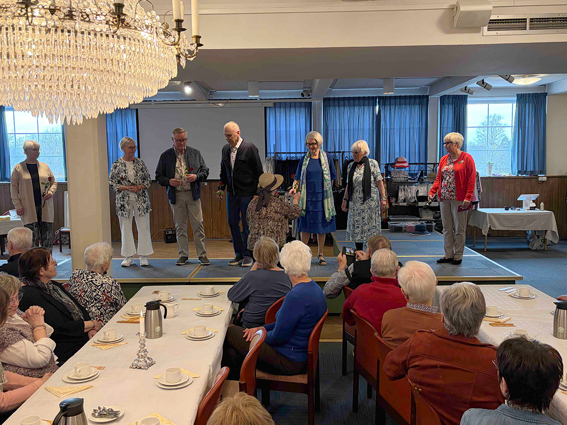 Vårens och sommarens mode presenterades av Seniorshopen med Kristina Fritz från Jönköping. Föreningens medlemmar agerade som mannekänger och visade upp den ena kollektionen efter den andra på ett förtjänstfullt sätt. Naturligtvis gick det att handla efter showen, och köplusten var stor efter den nya vårkollektionen. Av någon anledning var det mest damer vid köpdisken!