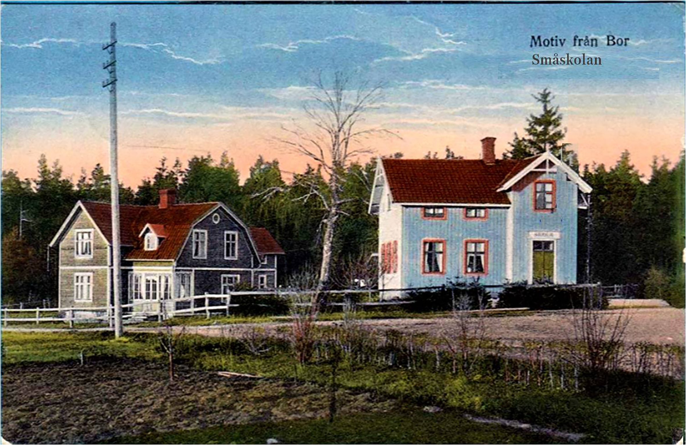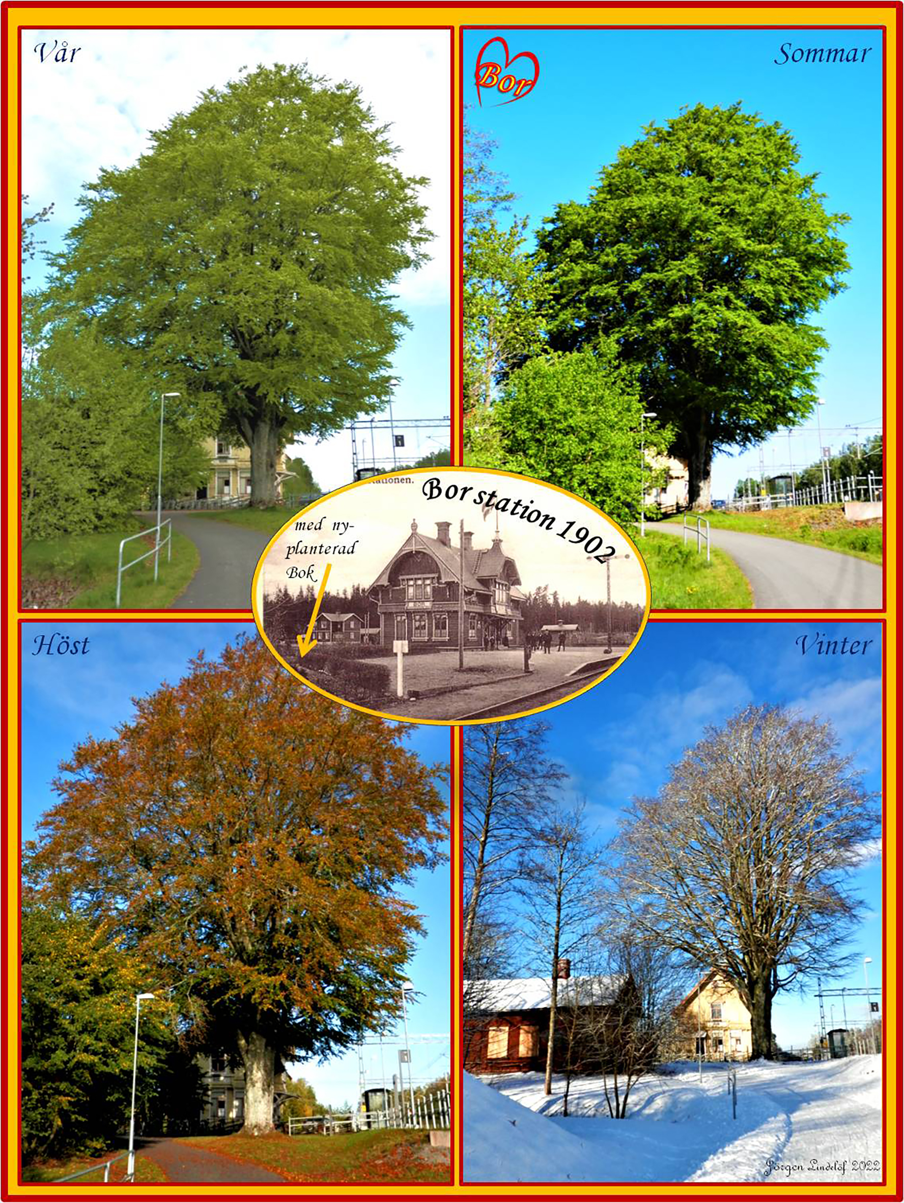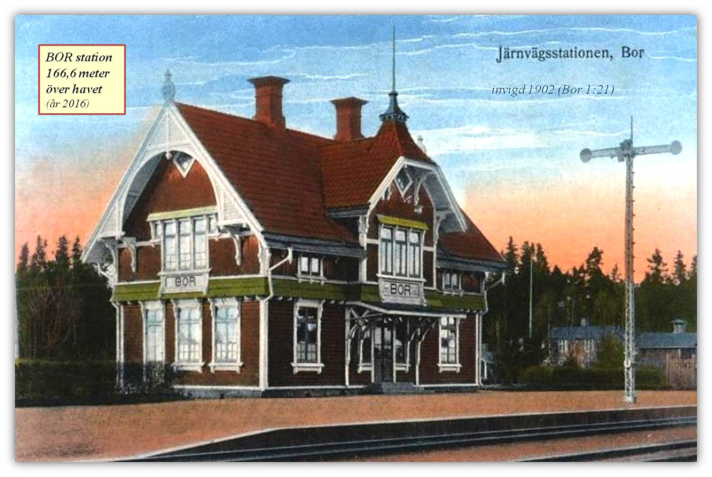 1/6(Vykort) Stationshuset i Bor vid invigningen 1902. Borås-Alvesta järnväg (BAJ) byggde ett flertal liknande stationshus längs järnvägen.2/6(Bilder: Jörgen Lindelöf) Vid sidan av stationen så ville stationsmästaren, föreståndaren för järnvägsstationen, ha en köksträdgård och en trädplanta. En bok planterades, då ca 2 år gammal. Idag är boken ca 123 år gammal och visar fortfarande sin skönhet vid varje respektive årstid.3/6(Vykort) Småskolan år 1922, som låg på andra sidan Värnamovägen mitt i Bor, mittför pizzerian.4/6Länsväg 113 söder om Bor, förbi Trolleklippa. Bilen på väg till Bor. Efter 1962 fick vägen beteckningen Riksväg 27 och numera så går 27:an på andra sidan Trolleklippa.5/6(Bild: Henry Widetoft) Sture Wahls bensin- och bilverkstad invid Värnamovägen i Bor, numera riven. I verkstadsbyggnaden fanns på 1930-talet tillverkning av korkbössor för barn. Från 1957 bedrev Wahl sin verksamhet här där han senare hade hjälp av Gunnar Carlsson. Wahl transporterade själv hit en större kiosk från R1:an, gamla E4:an.6/6(Bild: Jörgen Lindelöf) En vältrafikerad dag vid bangården i Bor 2020. Ser ibland ut så, även i dag!