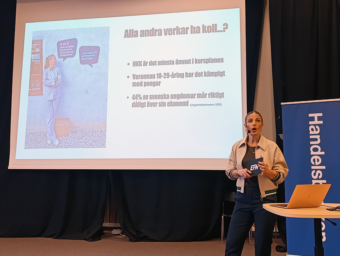 – Anledningen till varför jag är här är för att det finns väldigt många personer runt om i Sverige som har fattat dåliga beslut kring sin privatekonomi och det har i sin tur har fått riktigt tråkiga följder på hela deras liv. Jag läste för bara fem minuter sedan en artikel där Kronofogden rapporterar att rekordmånga vuxna människor i Sverige sitter hos Kronofogden och då påminner jag er om att ni lever i en fantastisk tid på en fantastisk plats. Ingen ska behöva må dåligt över pengar, säger hon.