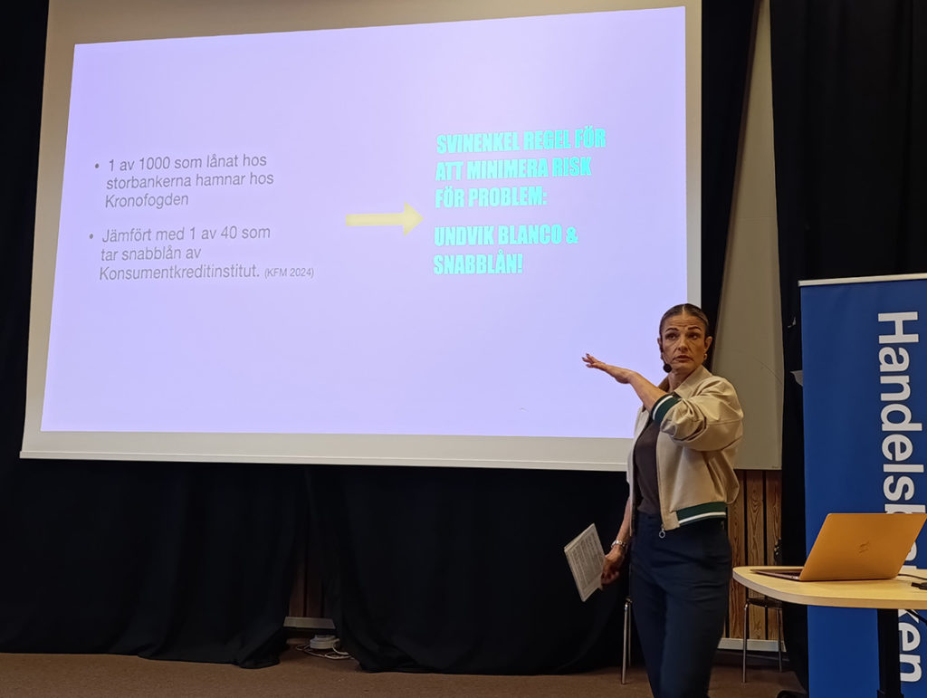 Orden kommer från Magdalena Kowalczyk, känd från Lyxfällan. Tillsammans med lokala representanter från Handelsbanken är hon på plats för att prata om privatekonomi och om riskerna med ett liv på kredit.