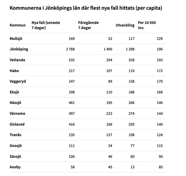 Flest nya fall i länet, sett till befolkningen, rapporterades i Mullsjö, där 229 fall per 10 000 invånare bekräftats under den senaste veckan.
