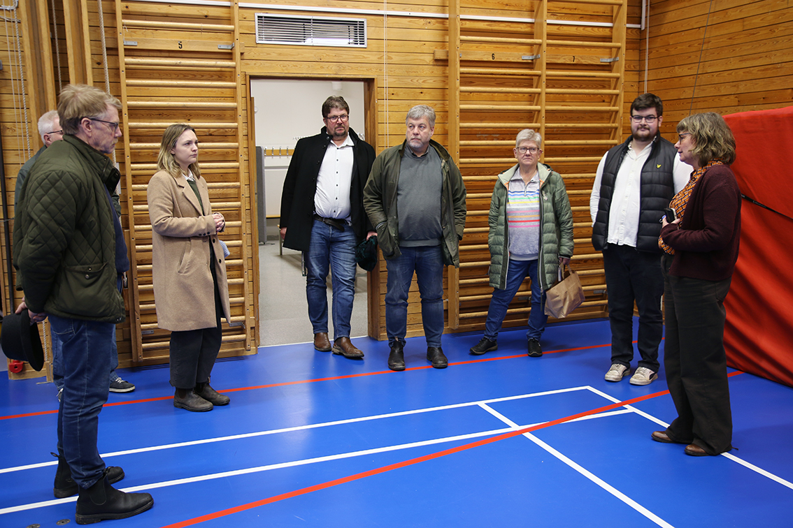 Anna-Stina Magnisson visar idrottshallen för politikerna. Bild: David Alin