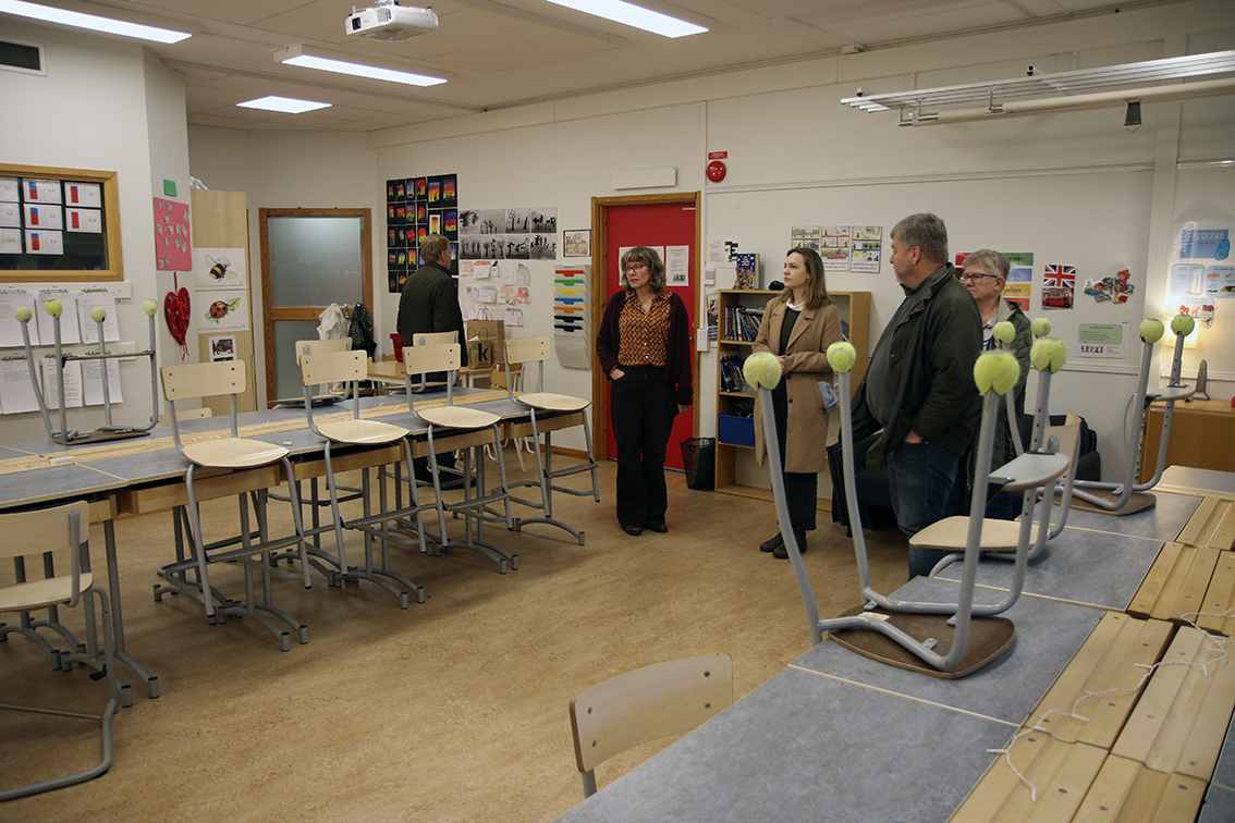 Anna-Stina Magnisson visar politikerna en skolsal. Bild: David Alin