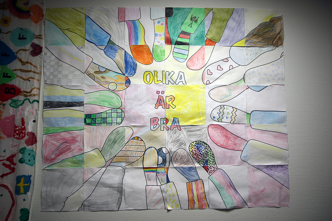 En teckning på en av skolans väggar med mottot: "Olika är bra". Bild: David Alin
