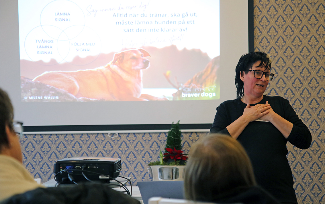 Milene Wallin berättar om sin Trygg Ensam-träning, där hon använder sig av en trestegsmodell: en lämna-signal, en tvångslämna-signal och en följa med-signal. Bild: David Alin