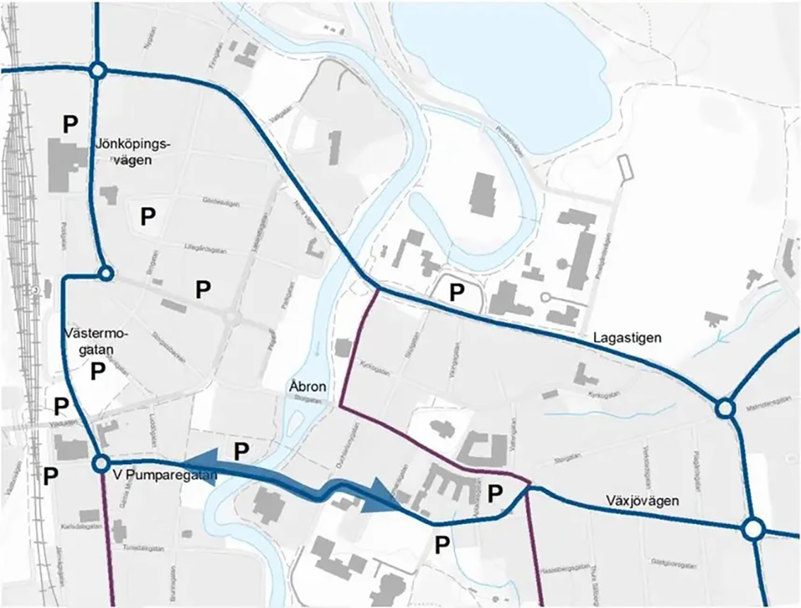Trafikplanen föreslår en ny bro med arbetsnamnet Pumparebron. Bron kopplar ihop Östra Pumparegatan med Västra Pumparegatan. En ny bro innebär ombyggnation av delar av Lagmansgatan, som blir en genomfartsgata. Pumparebron, tillsammans med andra gator, skapar en ringled runt centrum, vilket ger smidigare tillgång till parkeringar och förbättrar trafiksituationen runt Apladalsskolan. Den nya bron säkerställer även ett bättre trafikflöde vid störningar på Lagastigen.