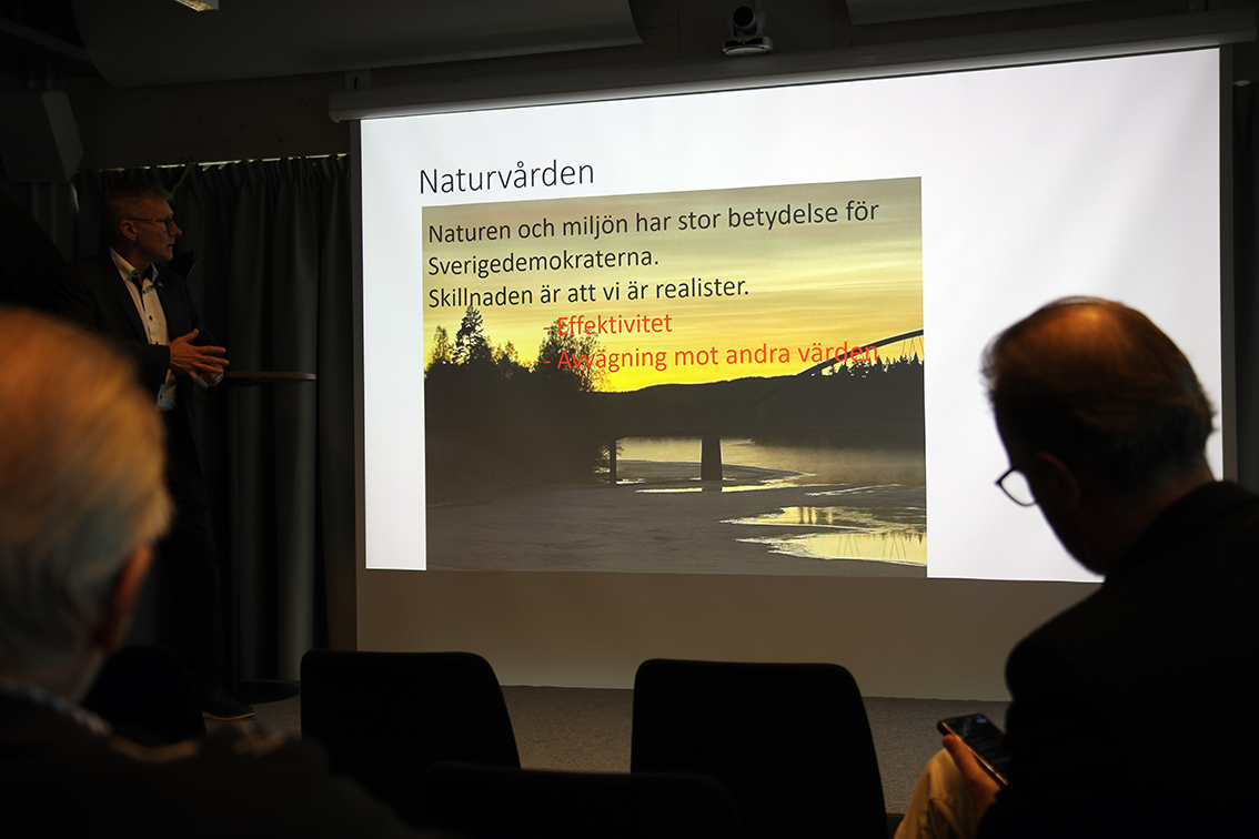– Skogen har stor betydelse för Sverige. Vi har en nettoexport på 120 miljarder kronor och 120 000 sysselsatta. Pengarna vi får från skogen motsvarar skatteintäkter motsvarande 32 000 tjänster inom offentlig sektor. Det är en landsbygdsmotor och möjliggör jordens fortbestånd. Förvaltar vi skogen väl? Det är ett stort tryck på naturen i omvärlden. Det svenska skogsbruket har troligen skuld till att nio arter har dött ut sedan 1850. Gammelskogar anses vara särpräglade miljöer, åtta procent av skogen är avsatt som reservat och 27 procent av skogen har någon form av skydd. För ett par årtionden sedan var skogsbruket inte hållbart. Nu har vi fyllt på våra timmerlager och svenskt skogsbruk är en succéhistoria, men står jag här framme och säger att vi inte behöver förändringar?