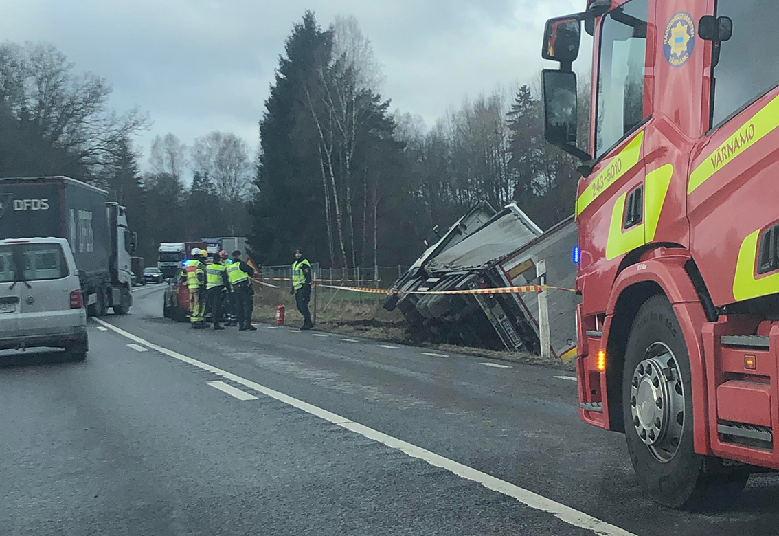 Vid halv elva kom larm till SOS om en trafikolycka med lastbil på riksväg 27 precis innan Forsheda. Texten uppdaterad klockan 16.00