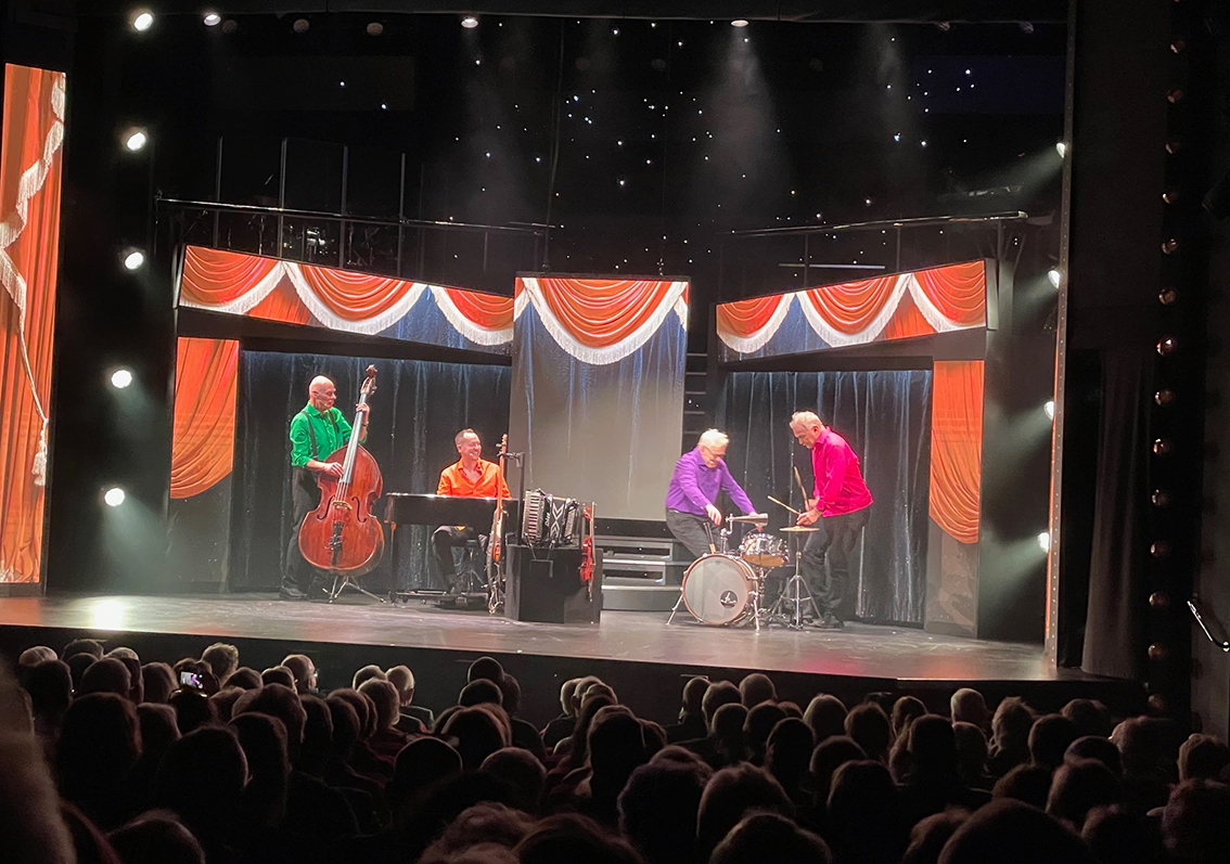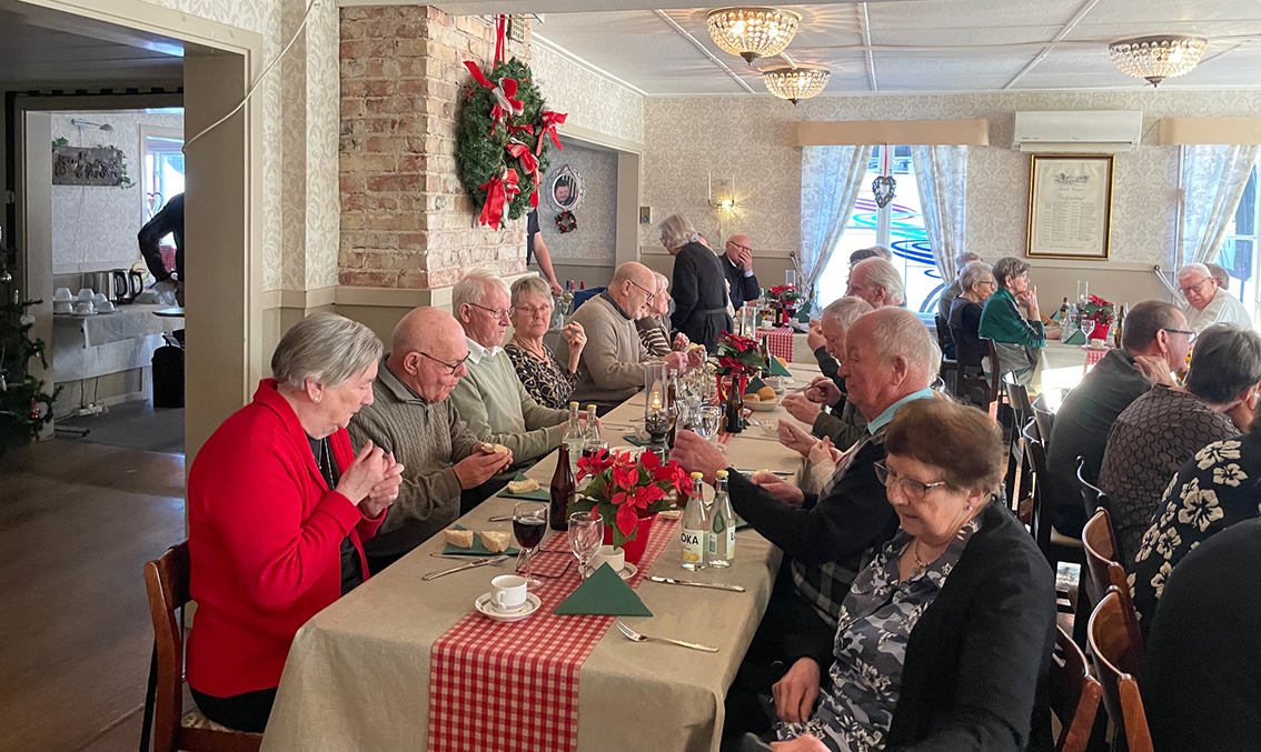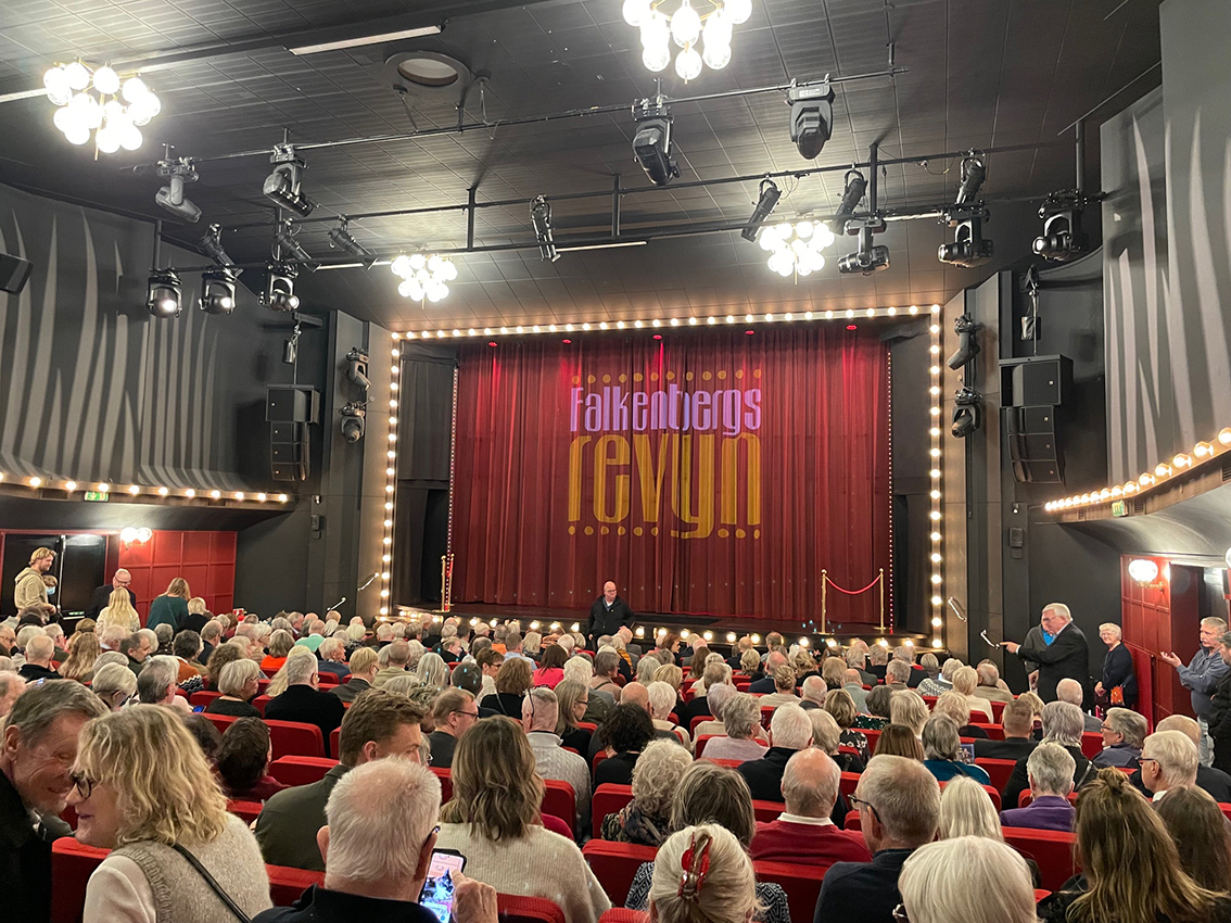 Så närmade vi oss Kvibille Gästgivargård där en god middag väntade på oss. Vi fyllde upp många platser där. Man kunde även köpa ost där vilket en del gjorde. Färden gick vidare till Falkenbergs Revyn ”Högt Spel” där det var i det närmaste fullsatt med förväntansfulla tittare. Det var högt tempo när föreställningen drog igång och skämtade med mångt och mycket som hänt under 2025. På gränsen till det otillåtna kom Påven och Kungen i rampljuset och även giftiga leksaker dryftades minutiöst.